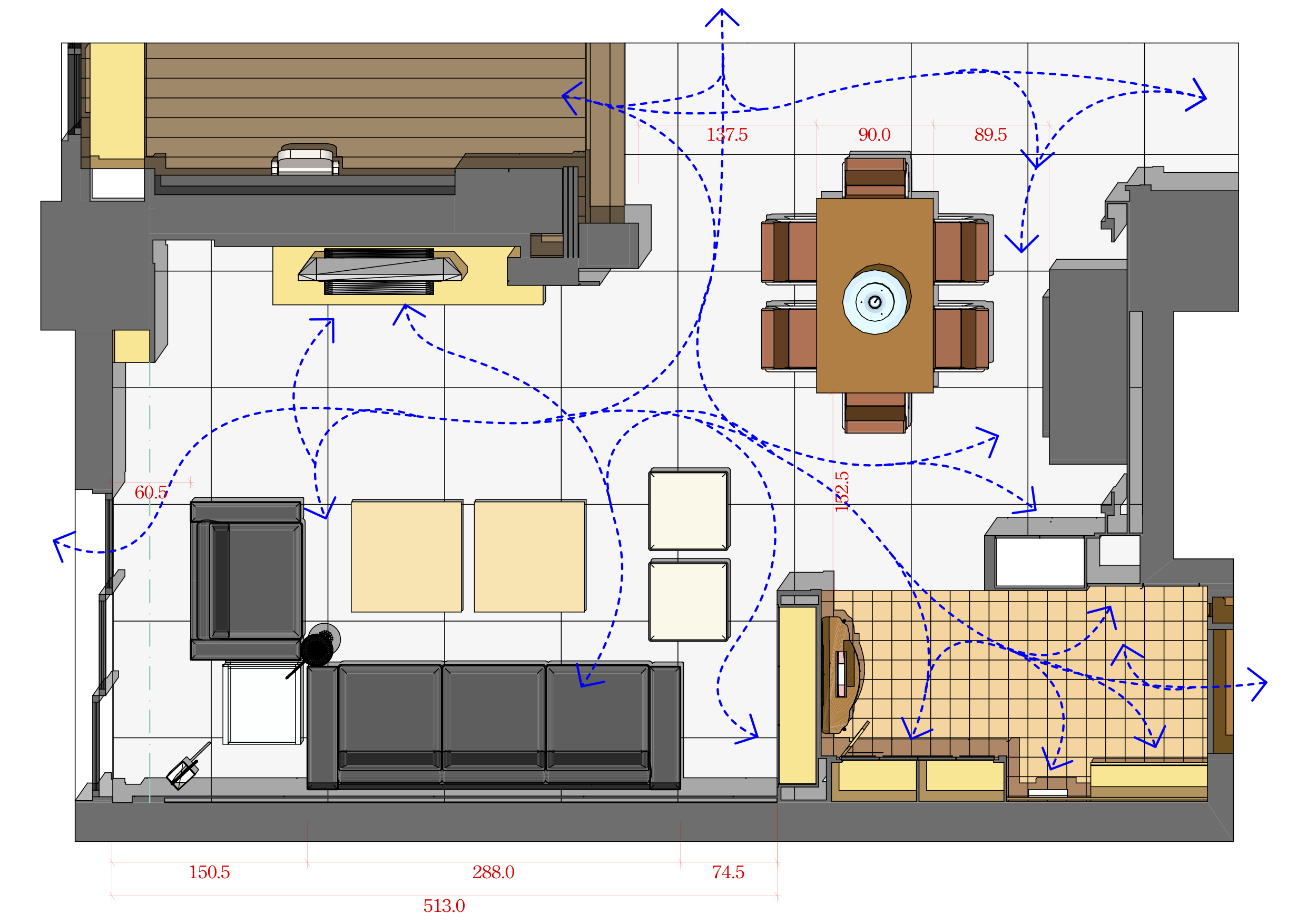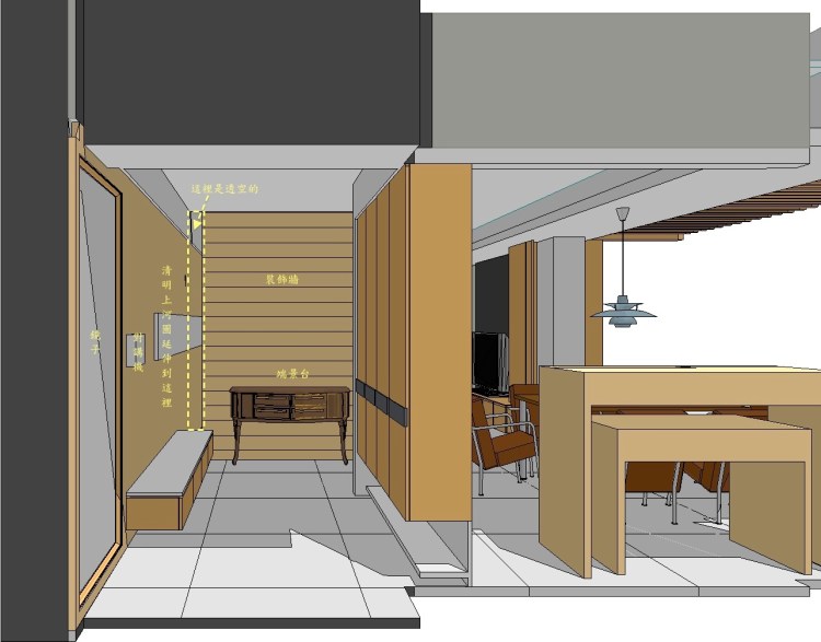 這裡是變頻冷氣隱藏式室內機安裝的最佳位置,餐廳、客廳各一台,玄關區域變成迴風區剛好抽梯間的新鮮空氣;玄關要使用自動感應式照明器具,並要用LED做夜燈和警急時的指示照明,連結大樓的警急供電系統。