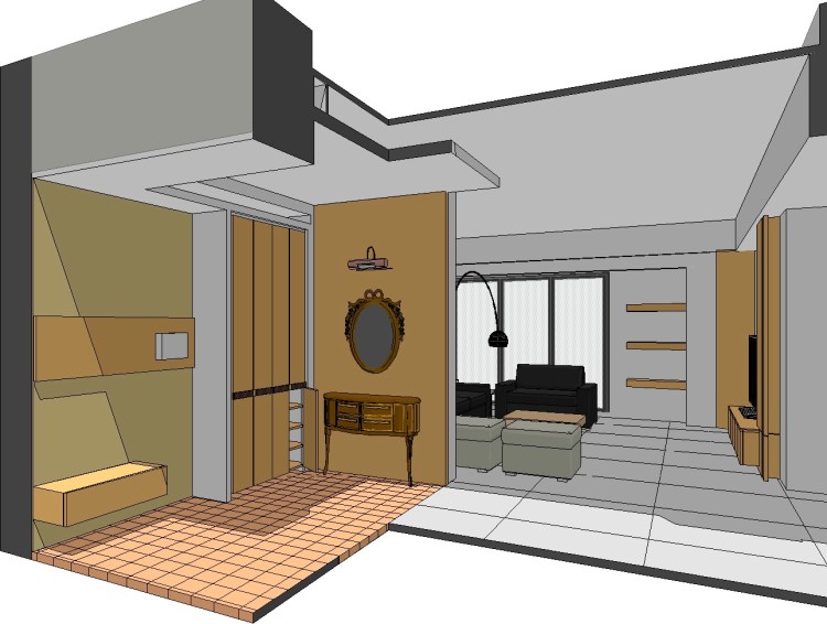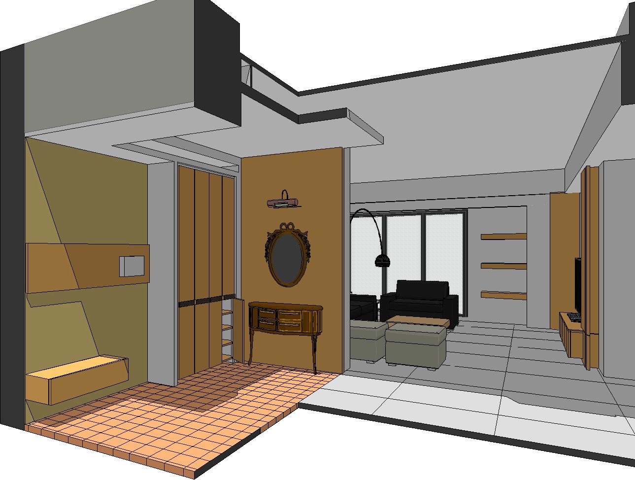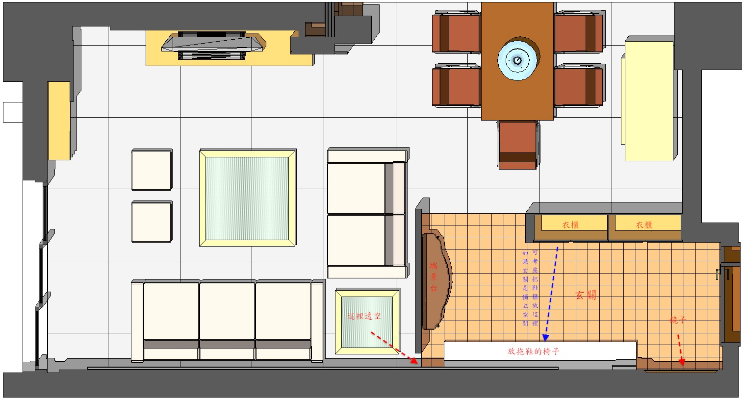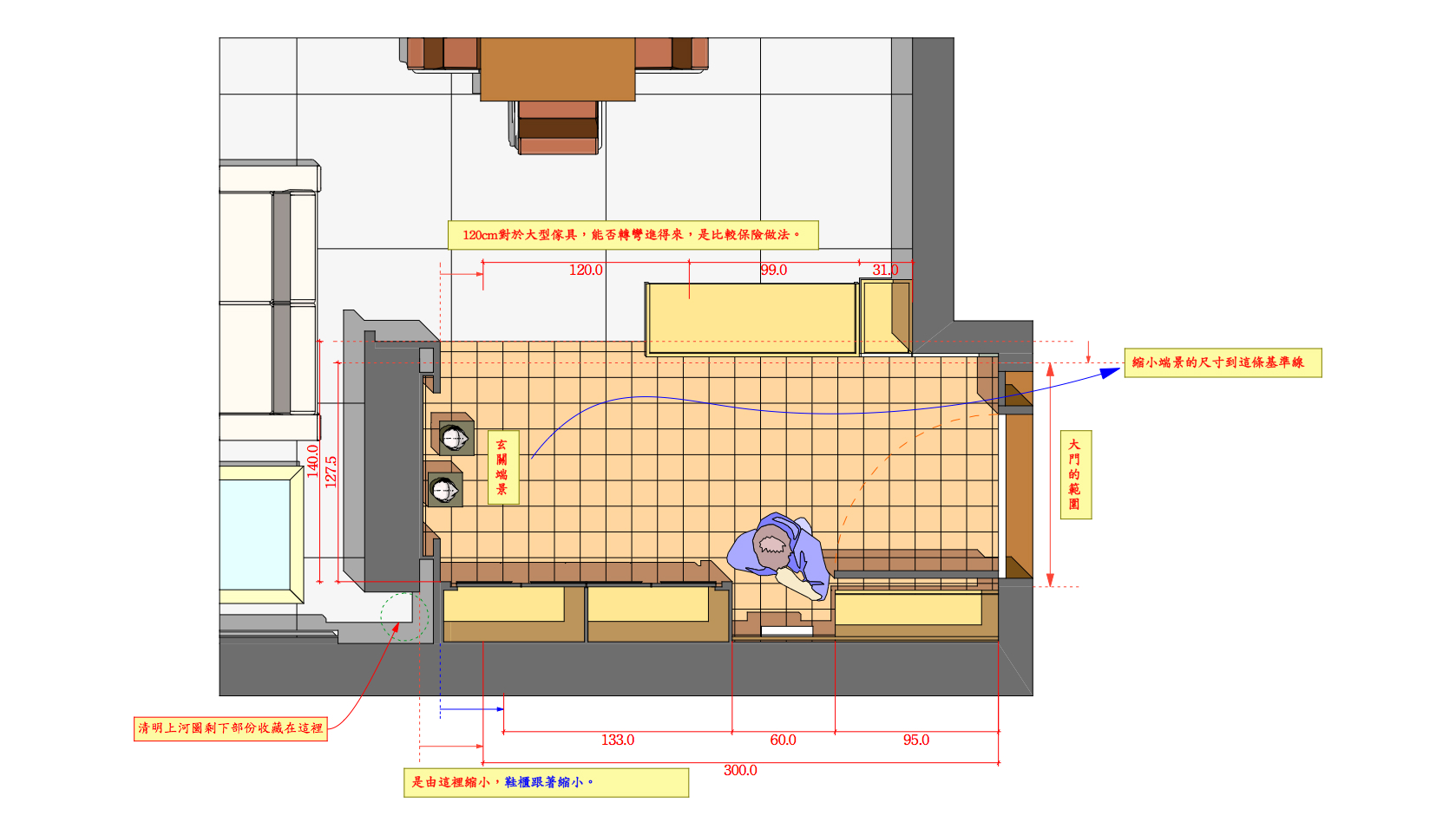 清明上河圖若延伸到玄關,空間的完整性不佳;整裝鏡在使用時必須關門,而且希望能在出門連串時刻都能照鏡子,穿鞋椅的時機能在關門時進行。端景不要用玄關櫃,落地造形藝品展示架才能呈現藝術品的氣勢,主牆面可用天然石材表現陽剛或是用布質帶來柔性感覺、也可以用木紋表現出自然風味。