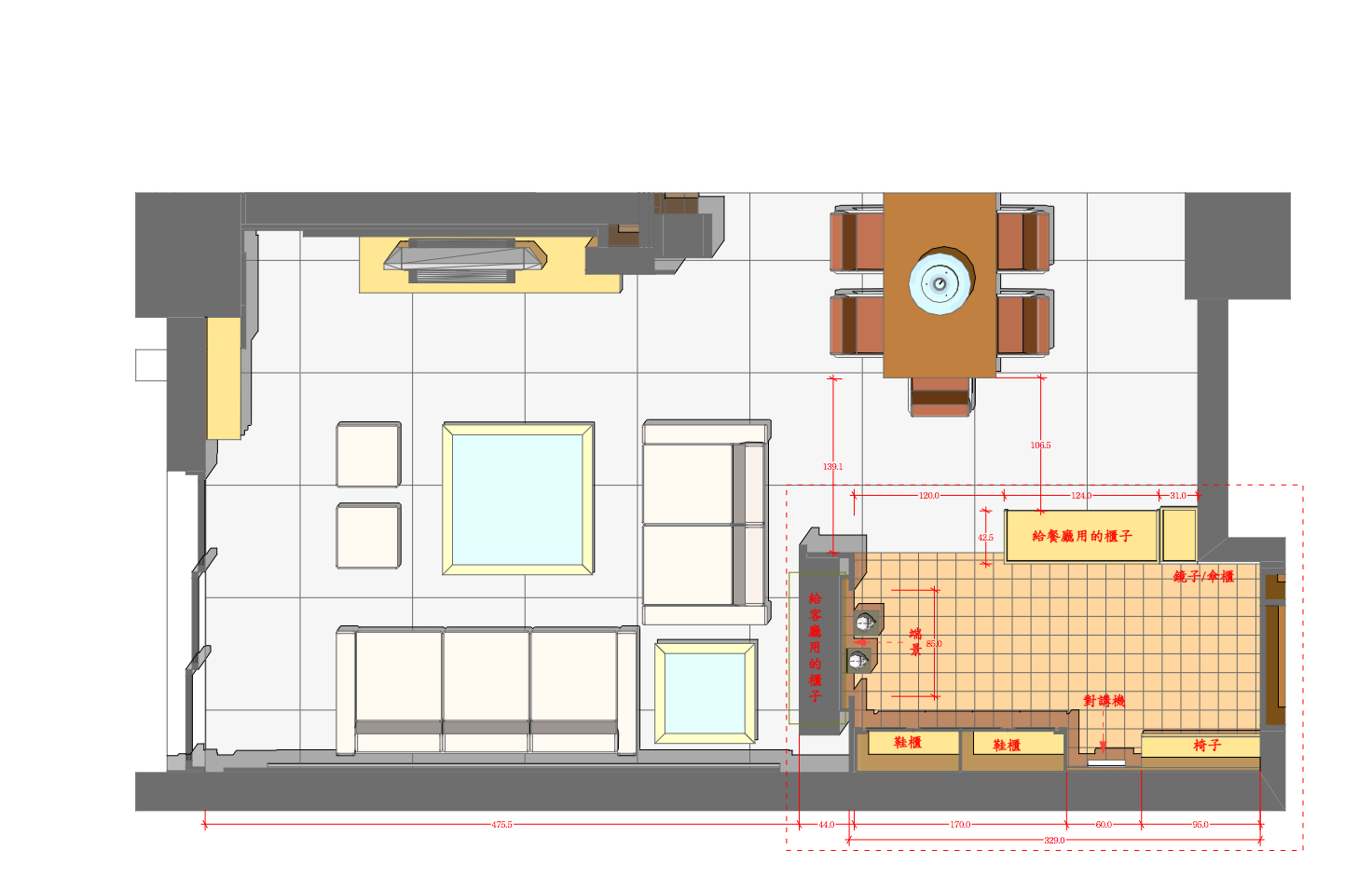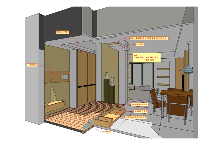 這是初步的想法,用3D溝通圖表示,3D圖只是表達使用的功能、動線、面積、體積,用於討論。
