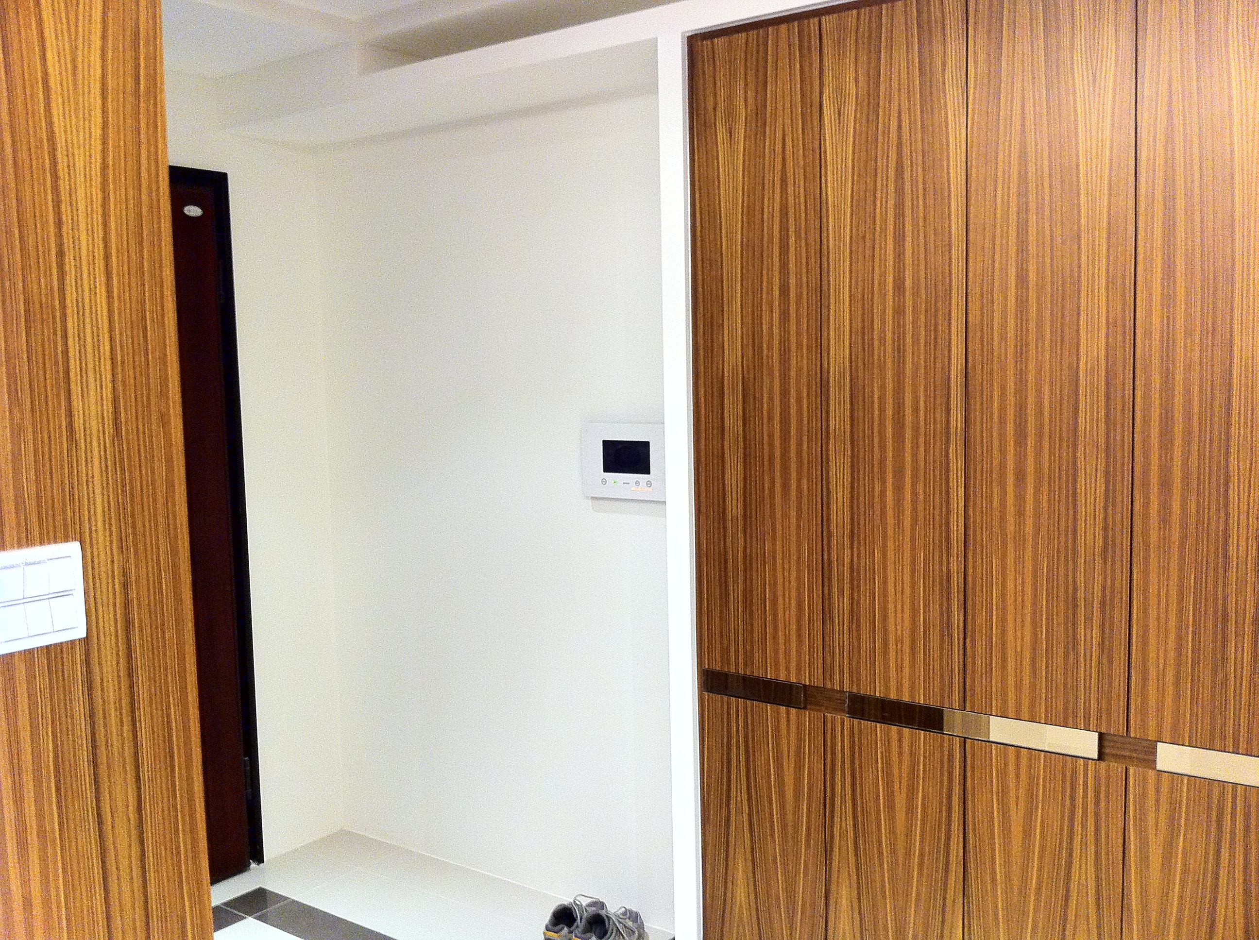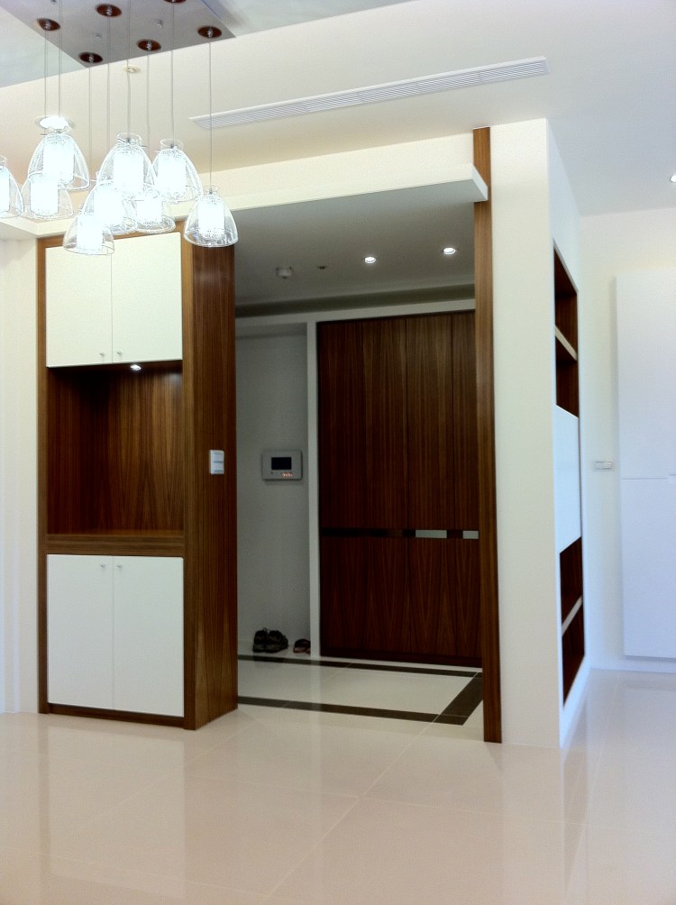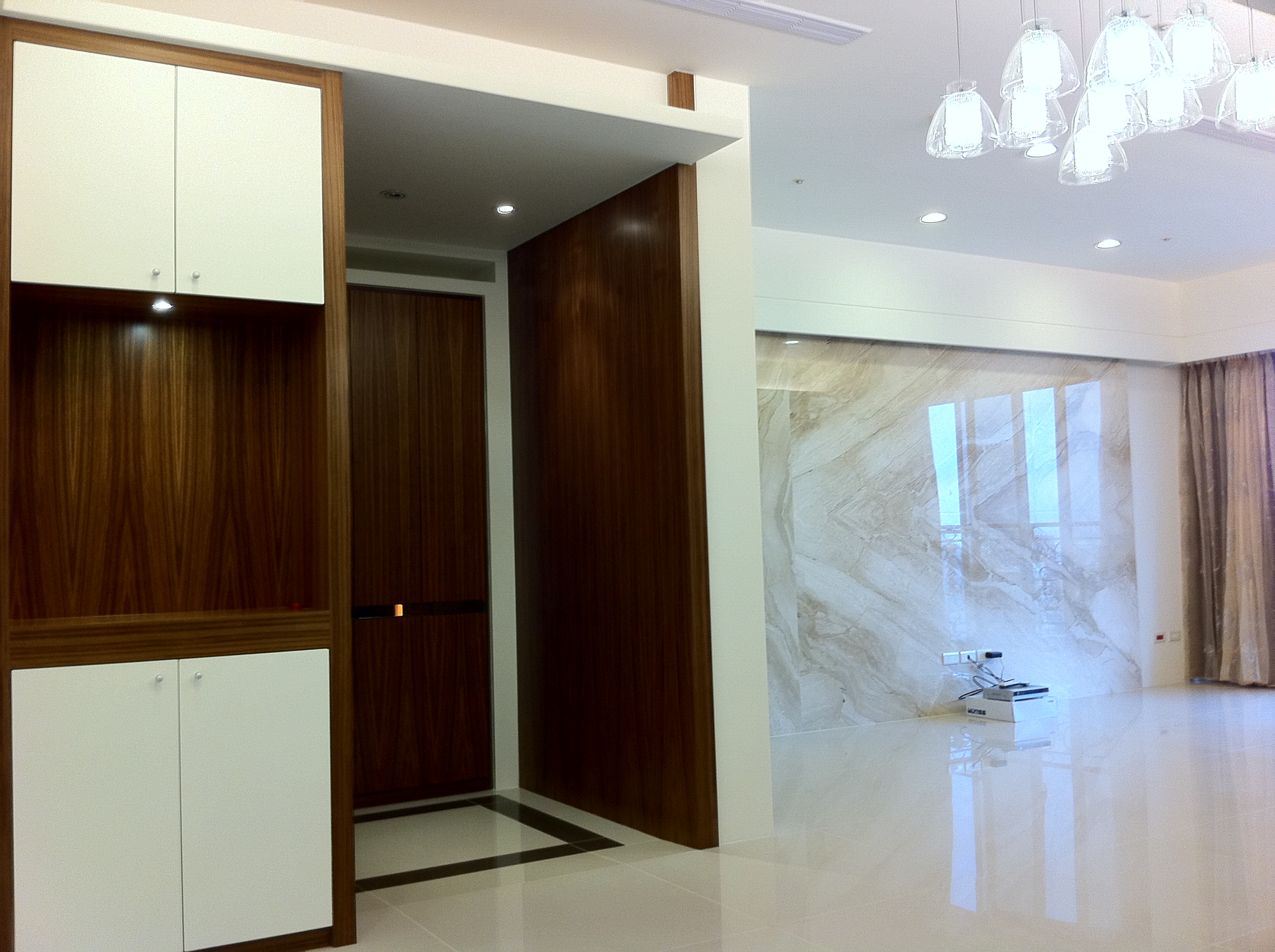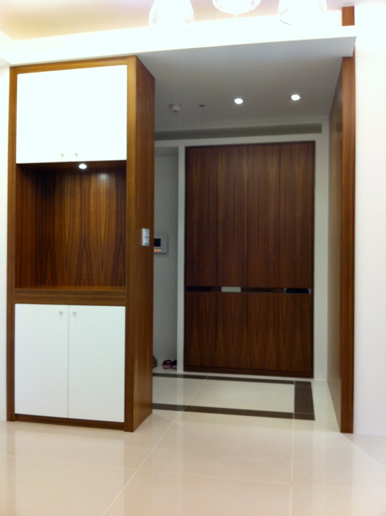 若從梯廳進來的角度,這是左側牆邊,圖中右側的鞋櫃採用無把手設計,分為上下門片型式,左側留白區域以後要放一張穿鞋椅。