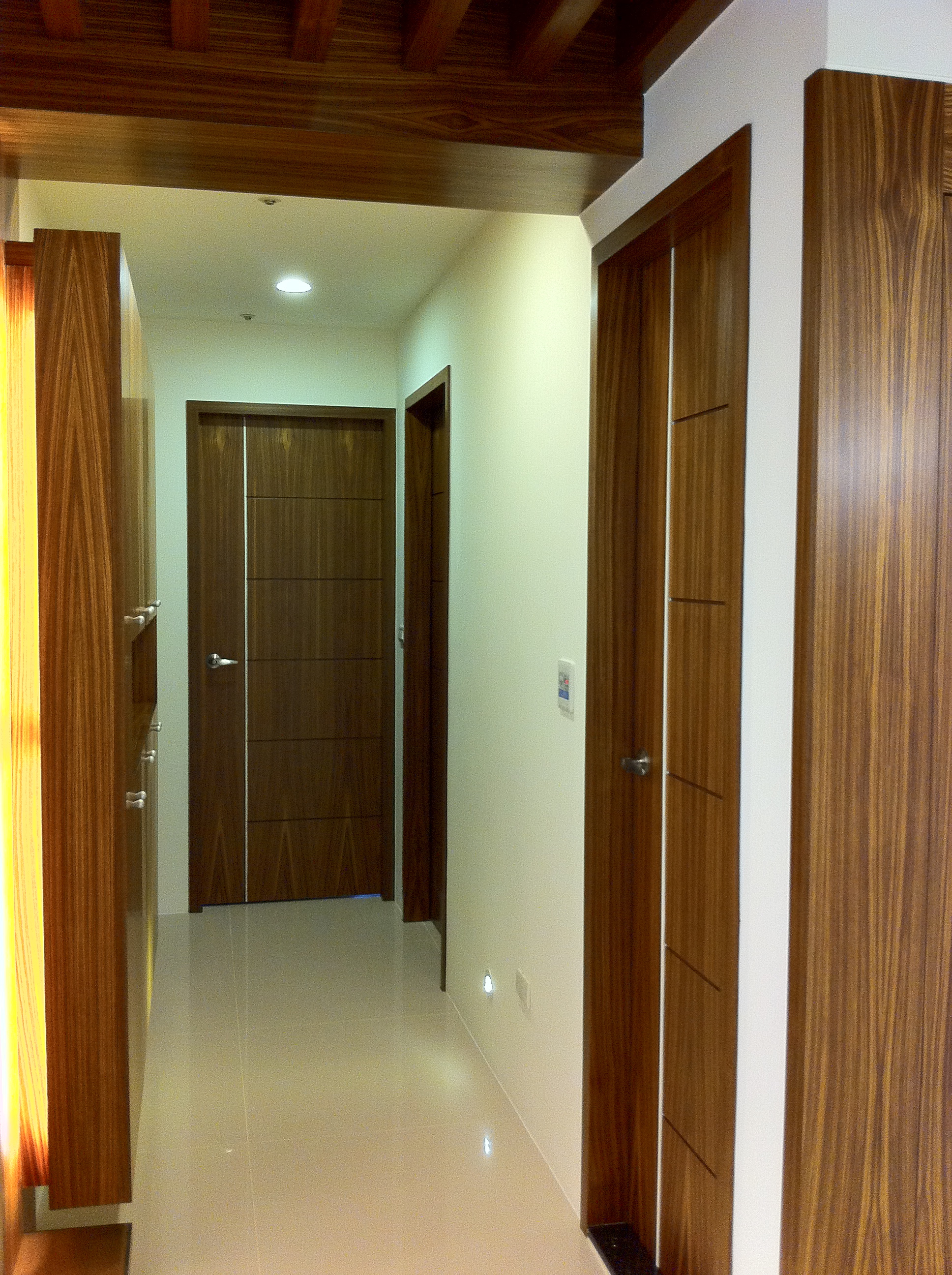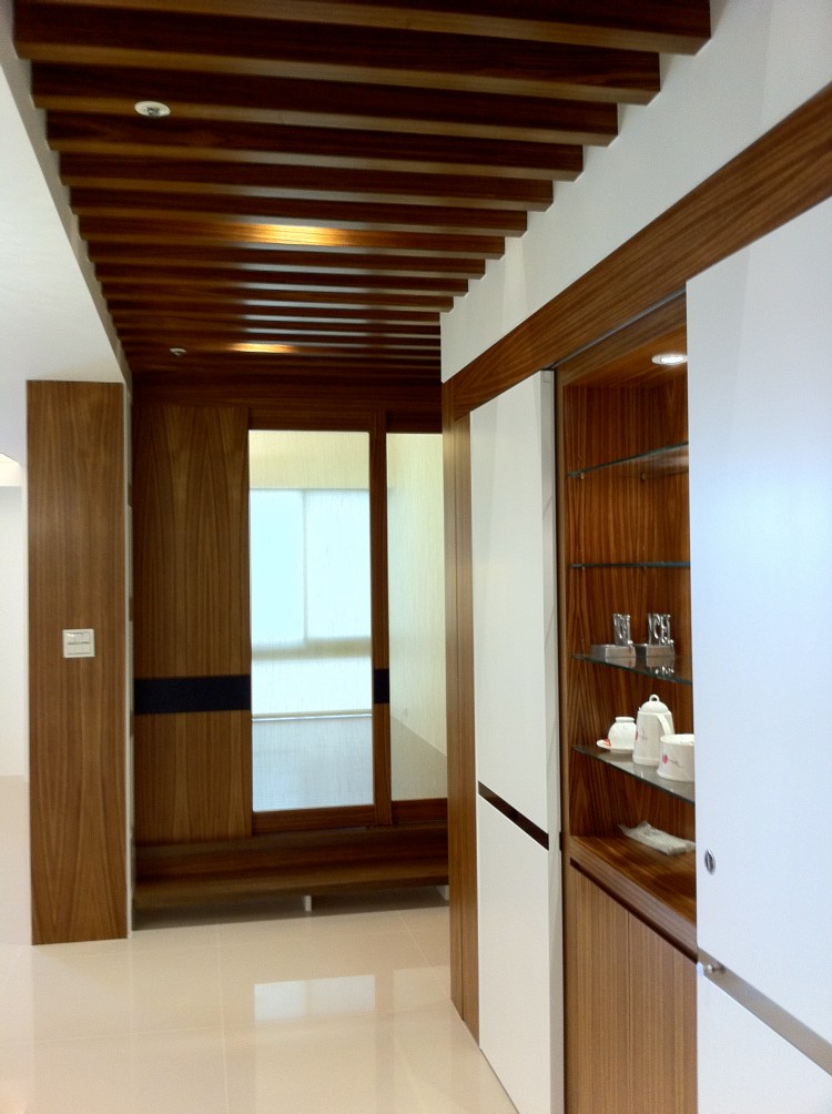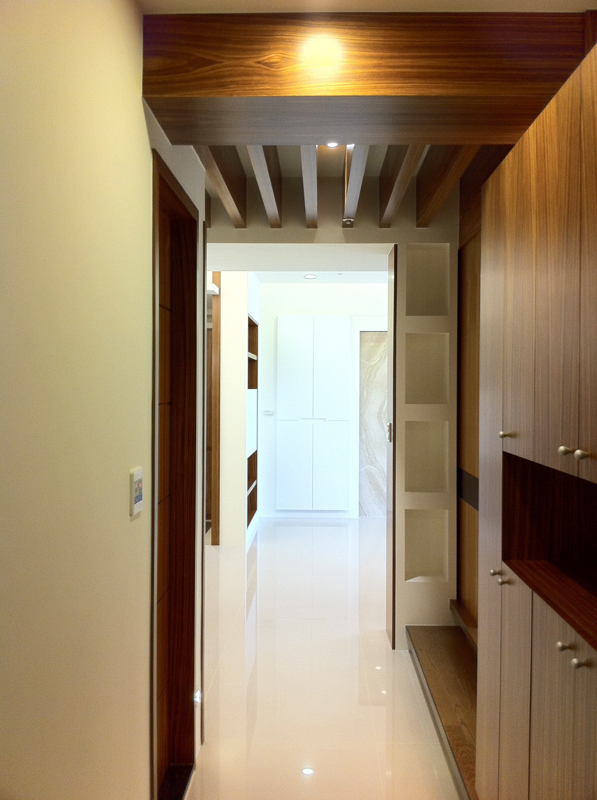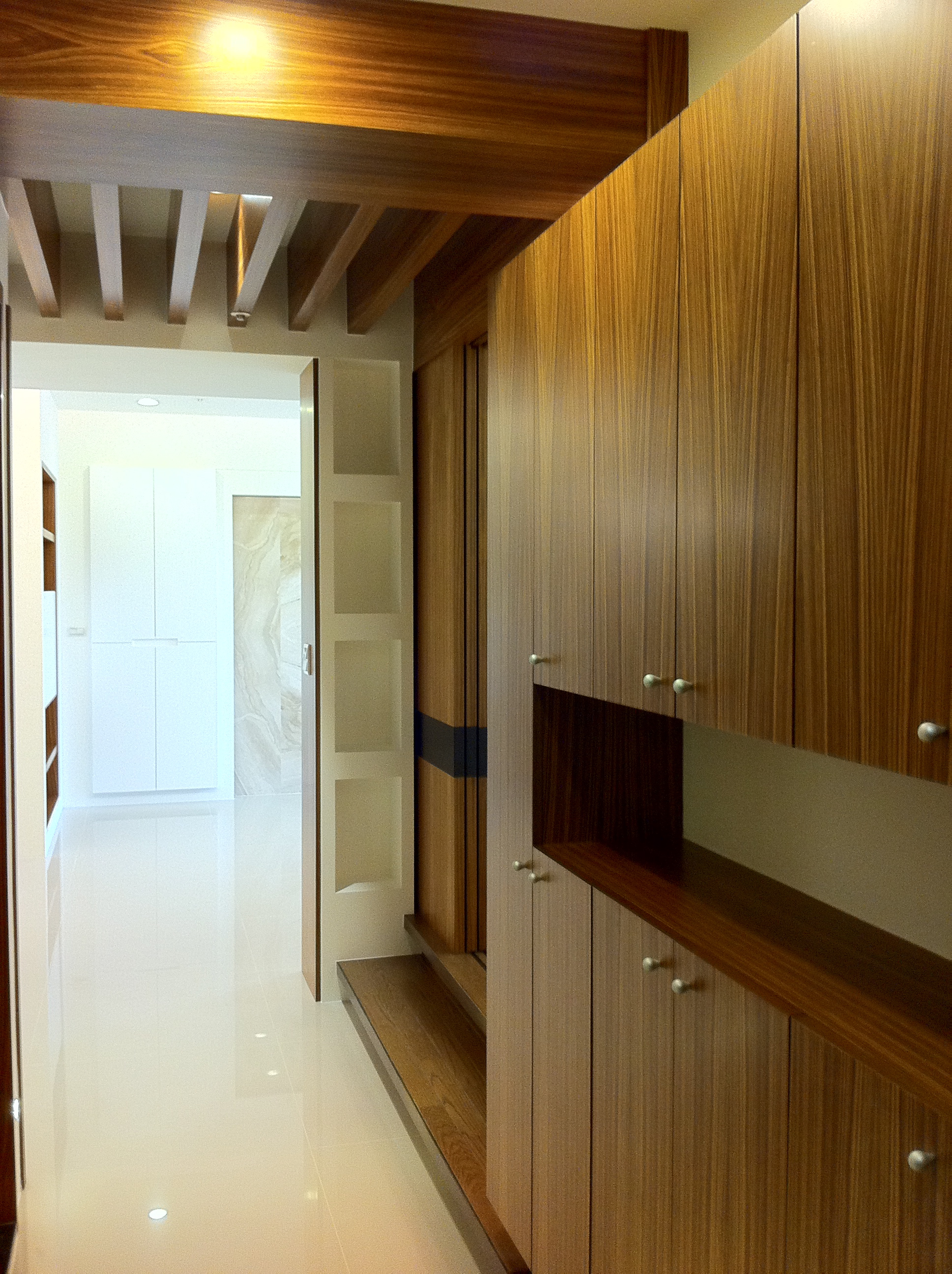 若從梯廳進來的角度,這是左側牆邊,圖中右側的鞋櫃採用無把手設計,分為上下門片型式,左側留白區域以後要放一張穿鞋椅。