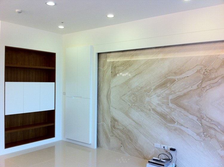 右側是客廳的電視主牆面,材質為義大利進口的帝諾石,白色的CD櫃和石材牆面合為一體,左側白色與木皮色混合的是一個展示櫃,整體造形為匯集天地之氣的意象。