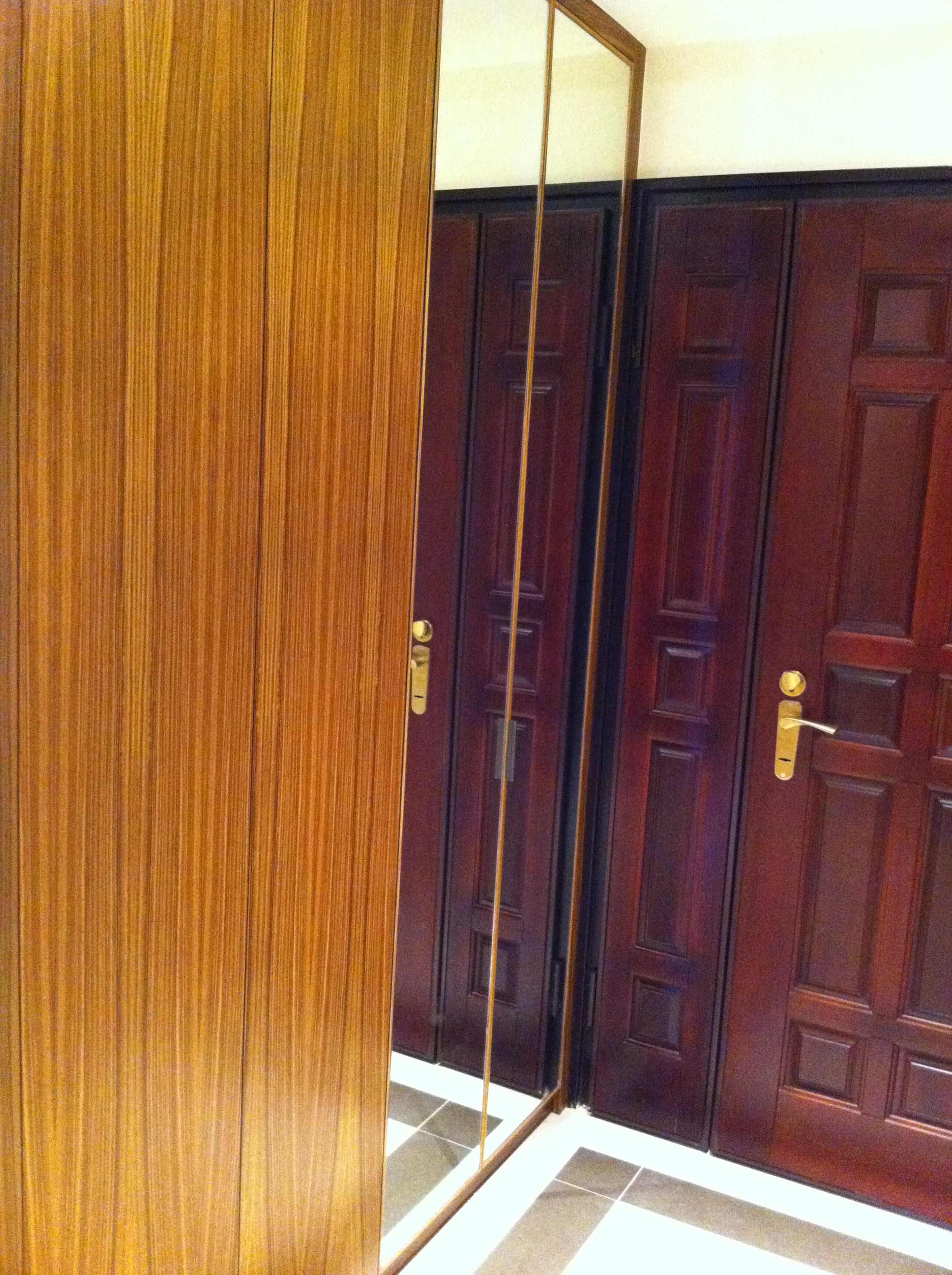 這是進門的右側牆邊,只有圖中的中間那片鏡子可以使用,用在放皮包、賬單、安全帽、雨傘…等。