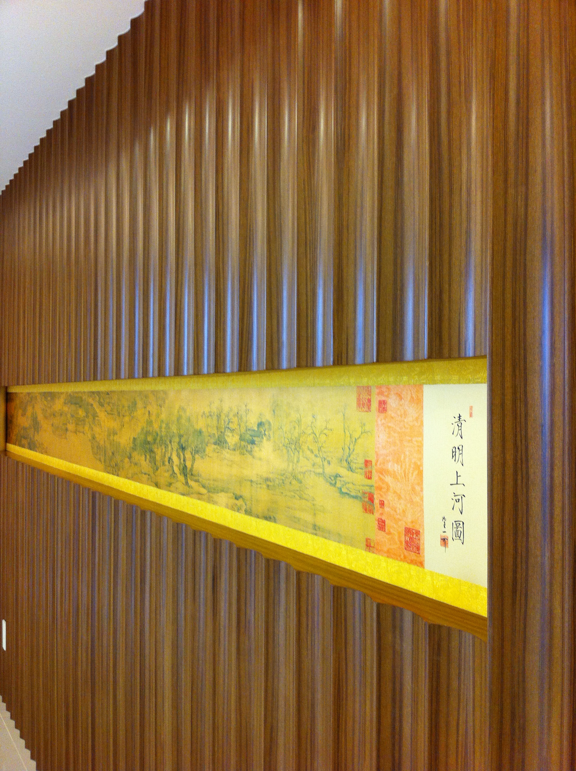 這是靜態活動的沙發區,整個精神圍繞在清明上河圖,現代與古代場景相互輝映,垂直的線條代表生命的延續,生生不息。