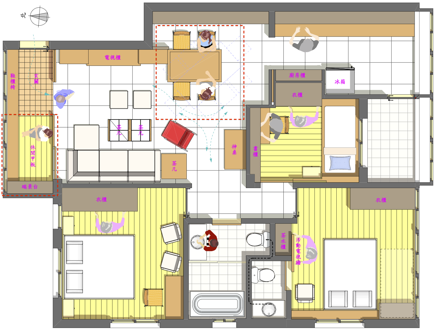 - 餐廳收納量不足,將餐桌與電視區結合,餐桌彈性調整使用人數。