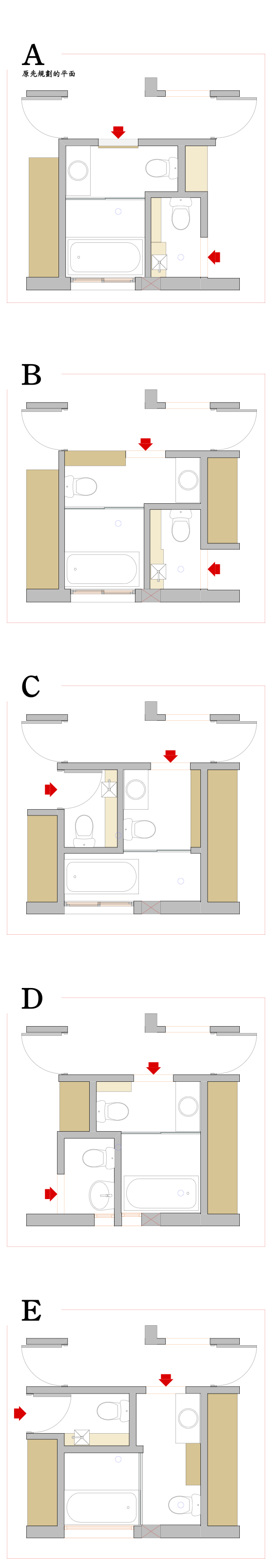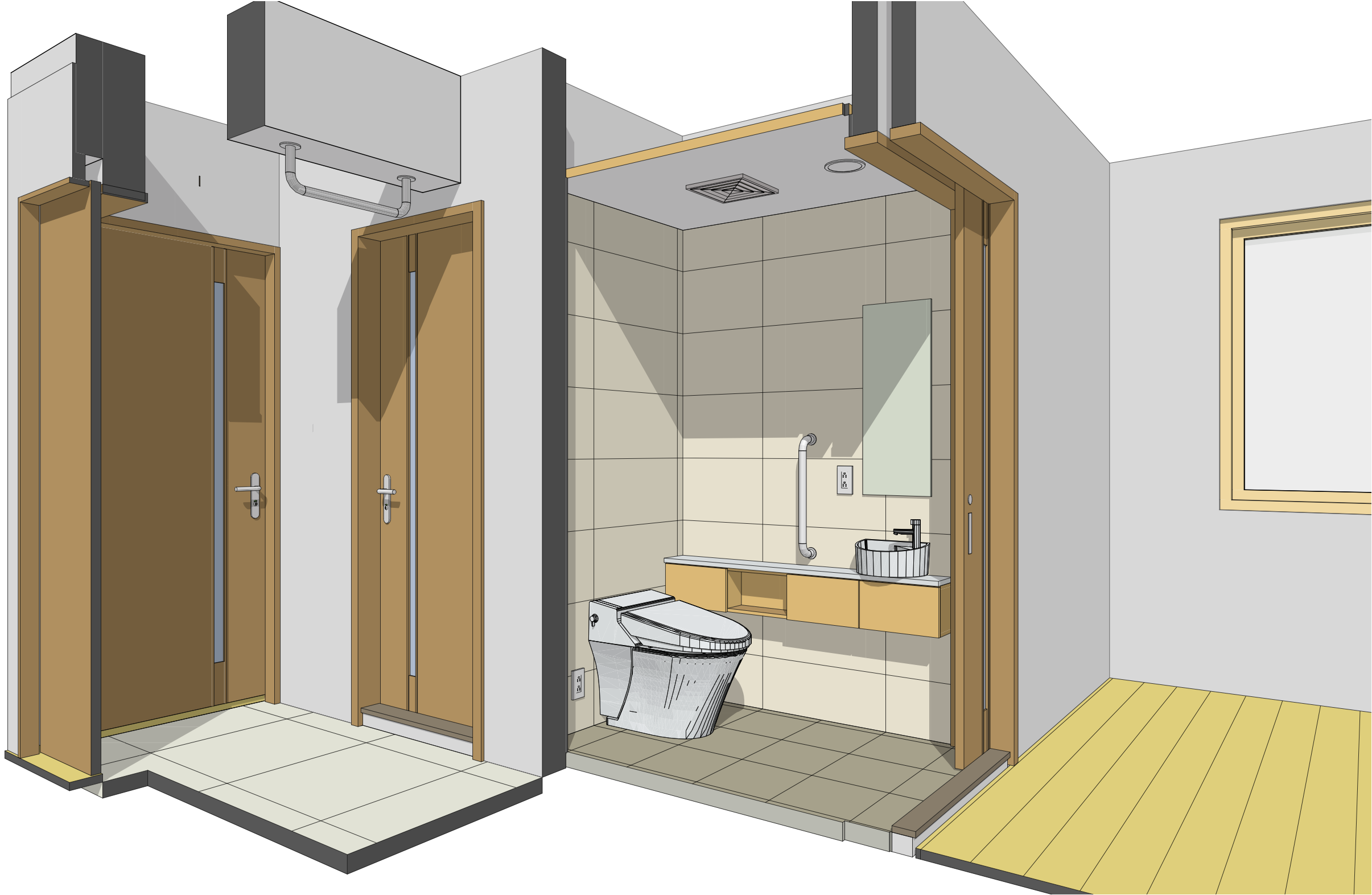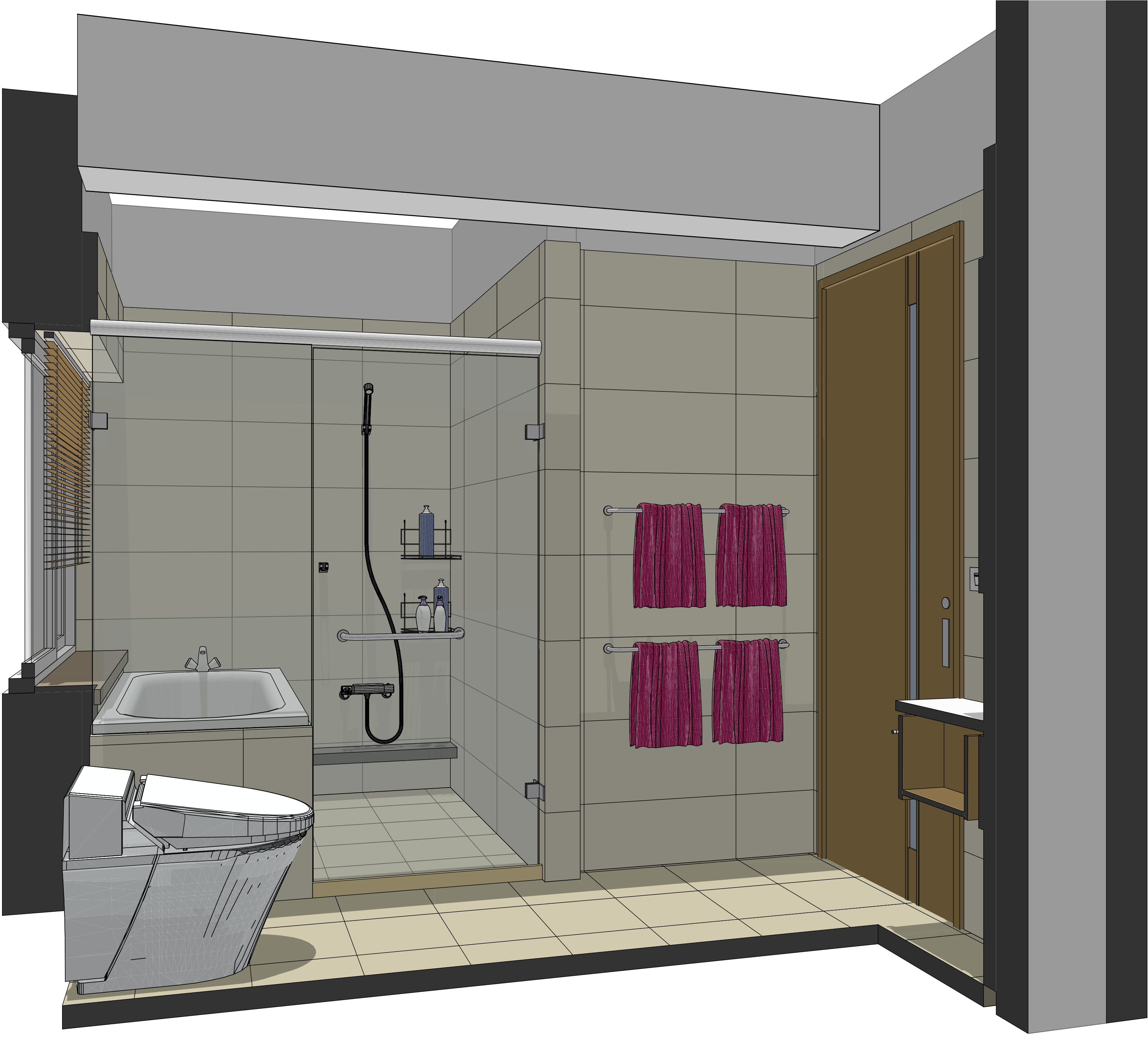 - 脫衣區及馬桶區的整合,轉往沐浴間的空間付予脫衣區的功能,並且將馬桶轉向將坐下的空間和脫衣區整合,因此增加了衣物/儲物的收納空間。