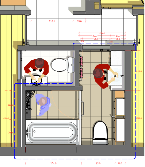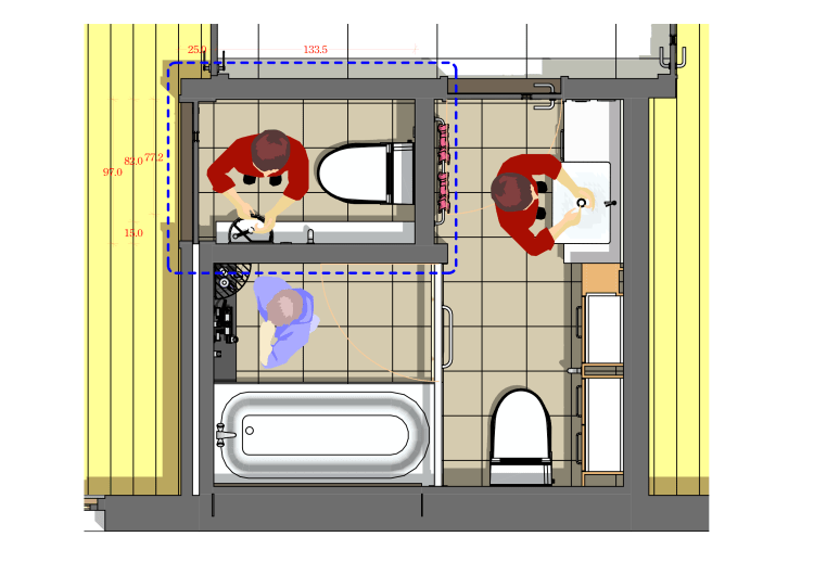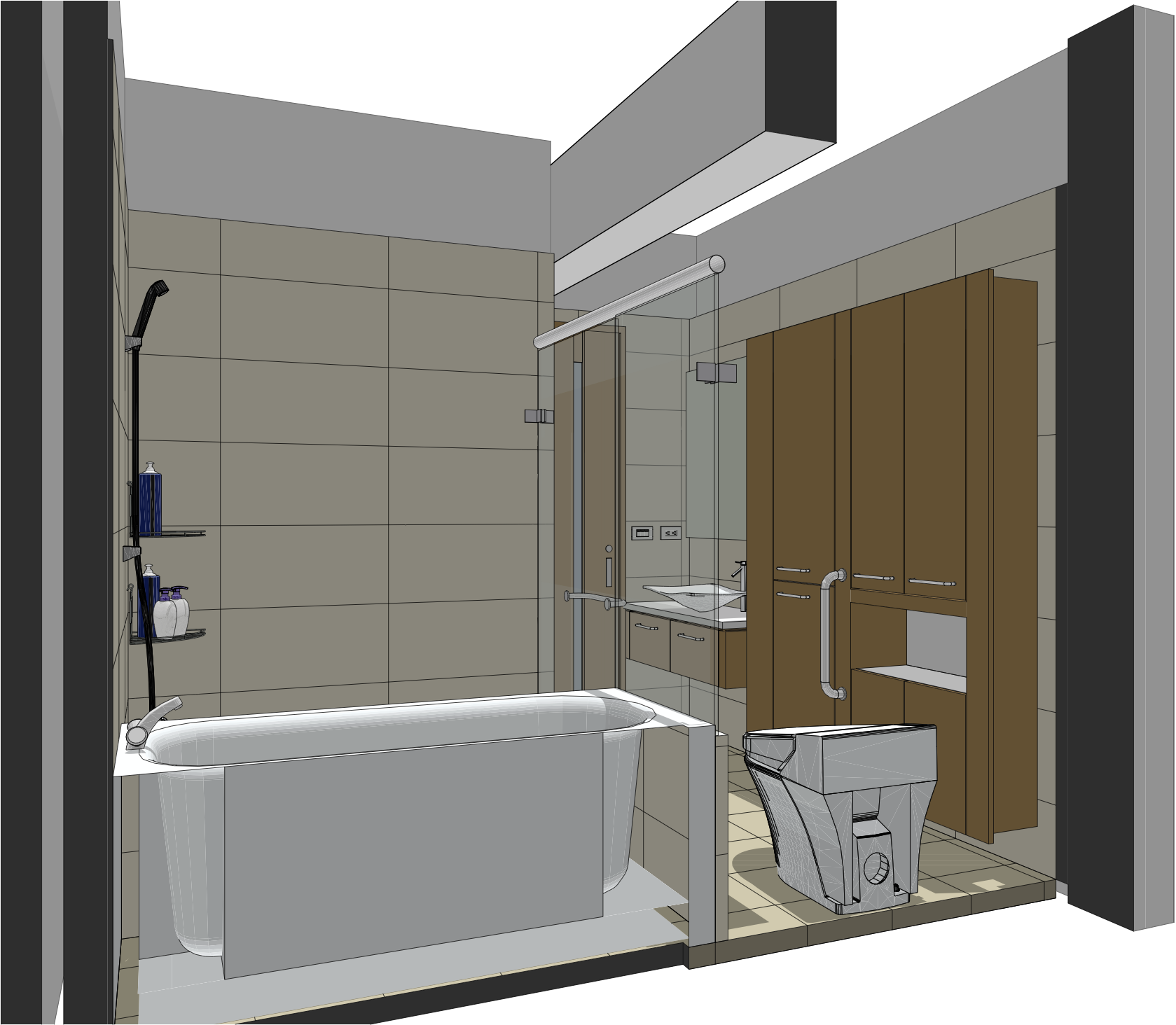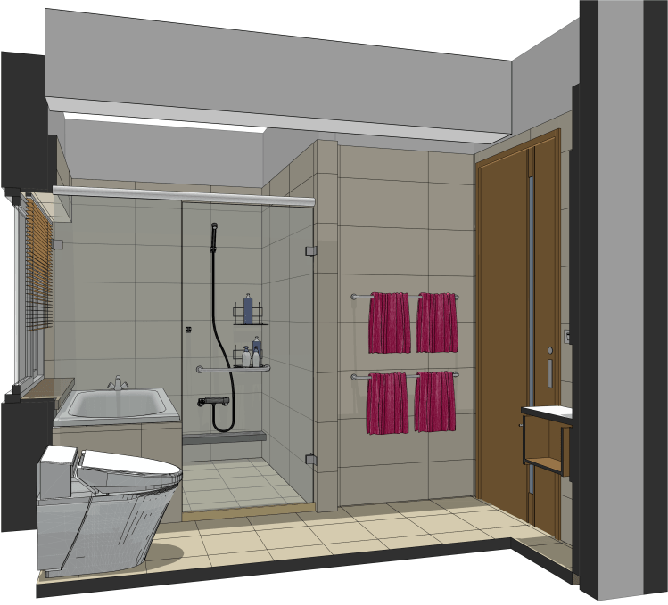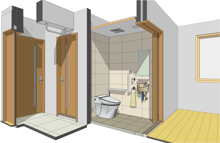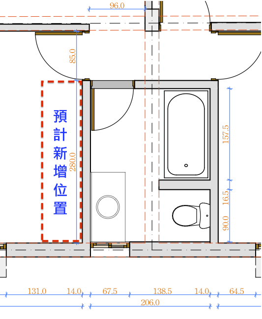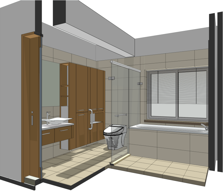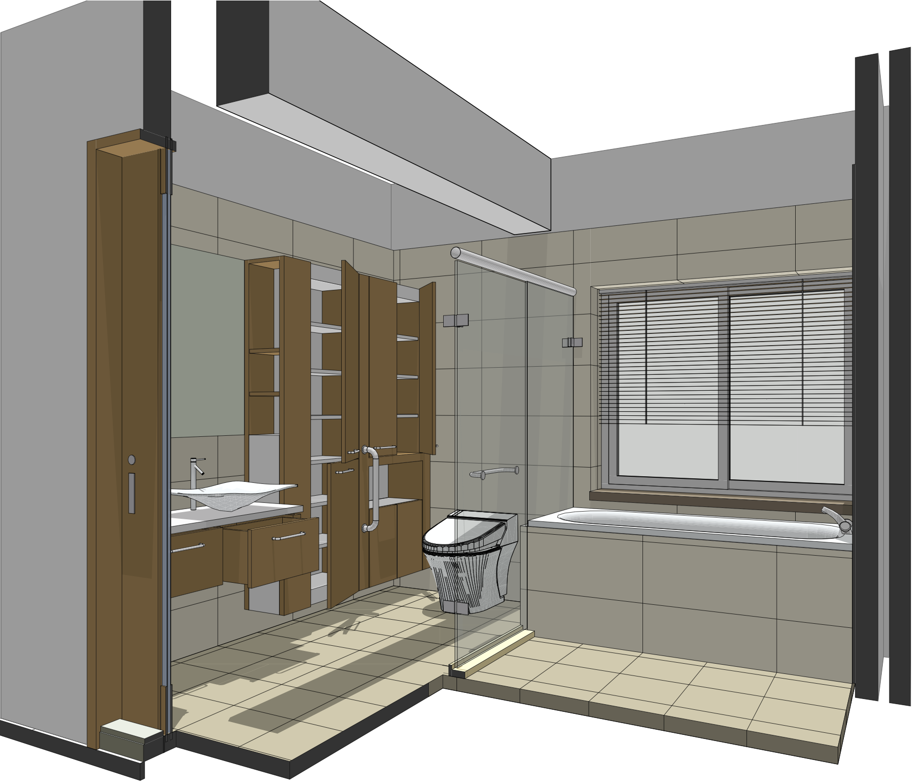 - 脫衣區及馬桶區的整合,轉往沐浴間的空間付予脫衣區的功能,並且將馬桶轉向將坐下的空間和脫衣區整合,因此增加了衣物/儲物的收納空間。