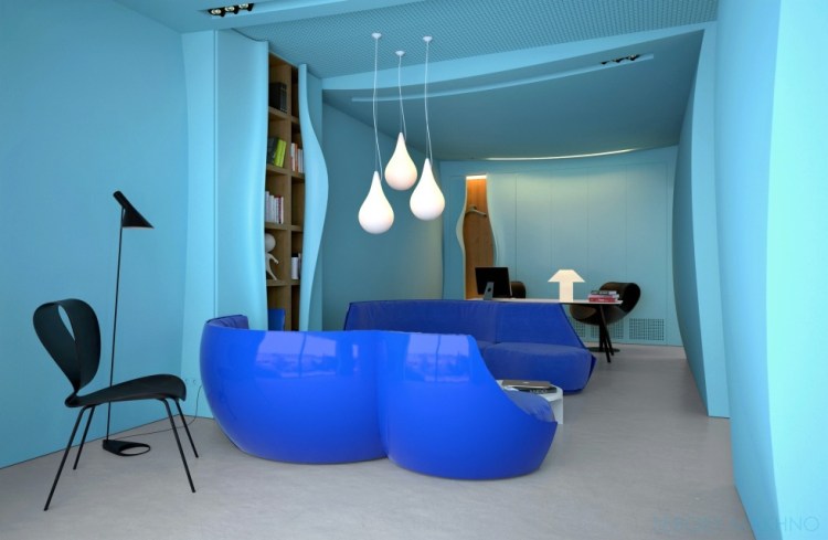 整個辦公室呈現藍色的冷調感,造形以扭曲的線條將長形空間產生了趣味感,鮮藍色的沙發具有穩定了空間的作用,溫暖木紋的書櫃具有指示視線的方線。