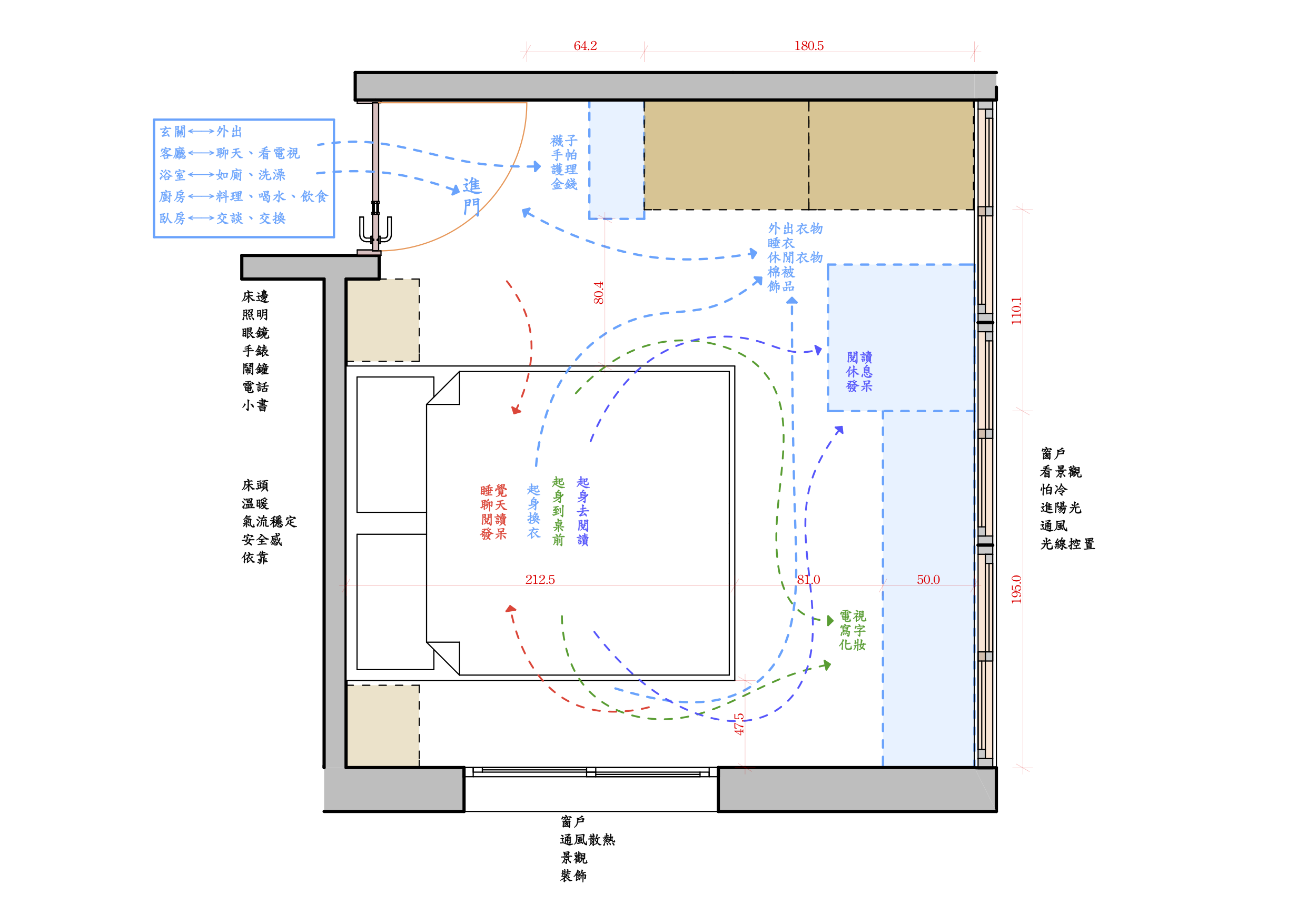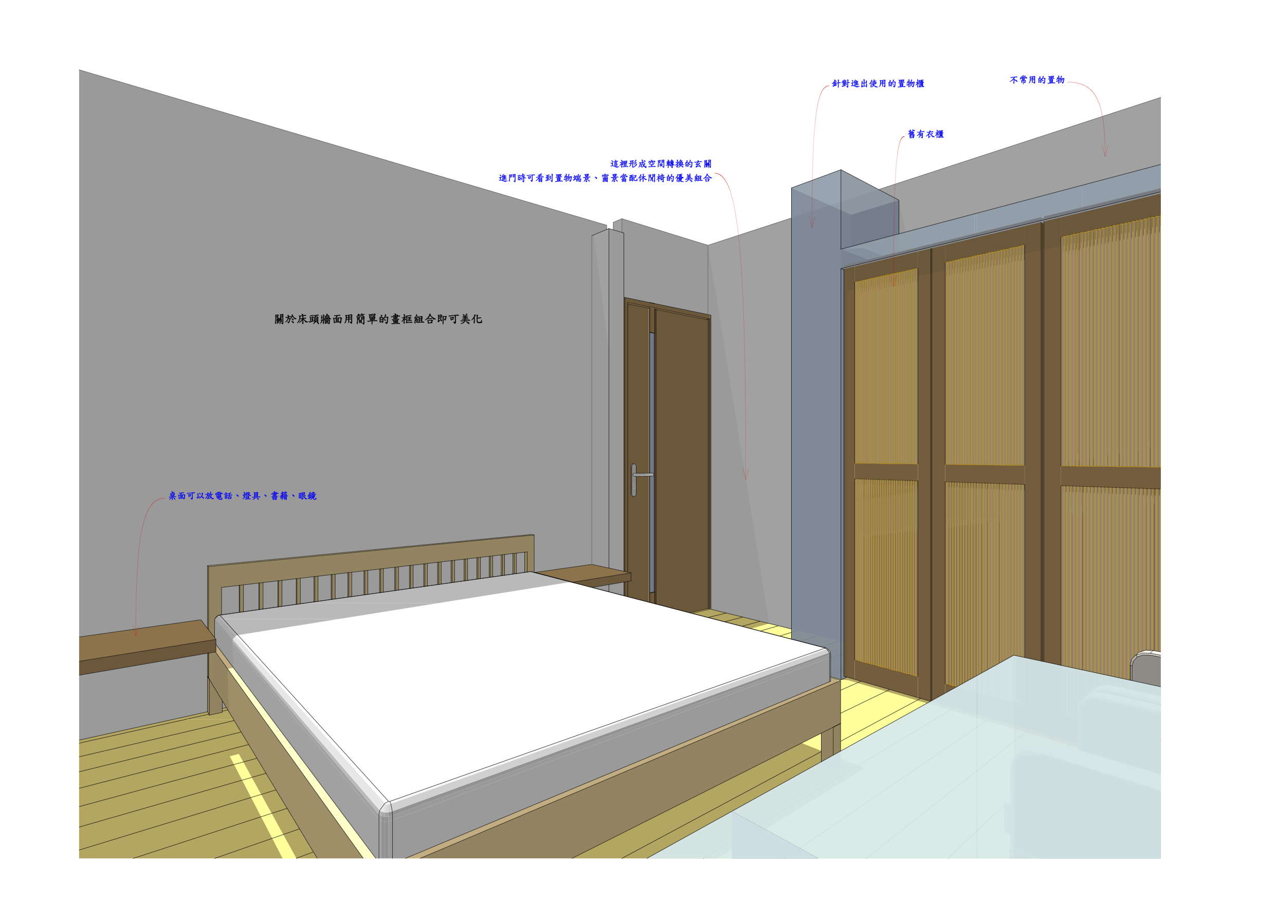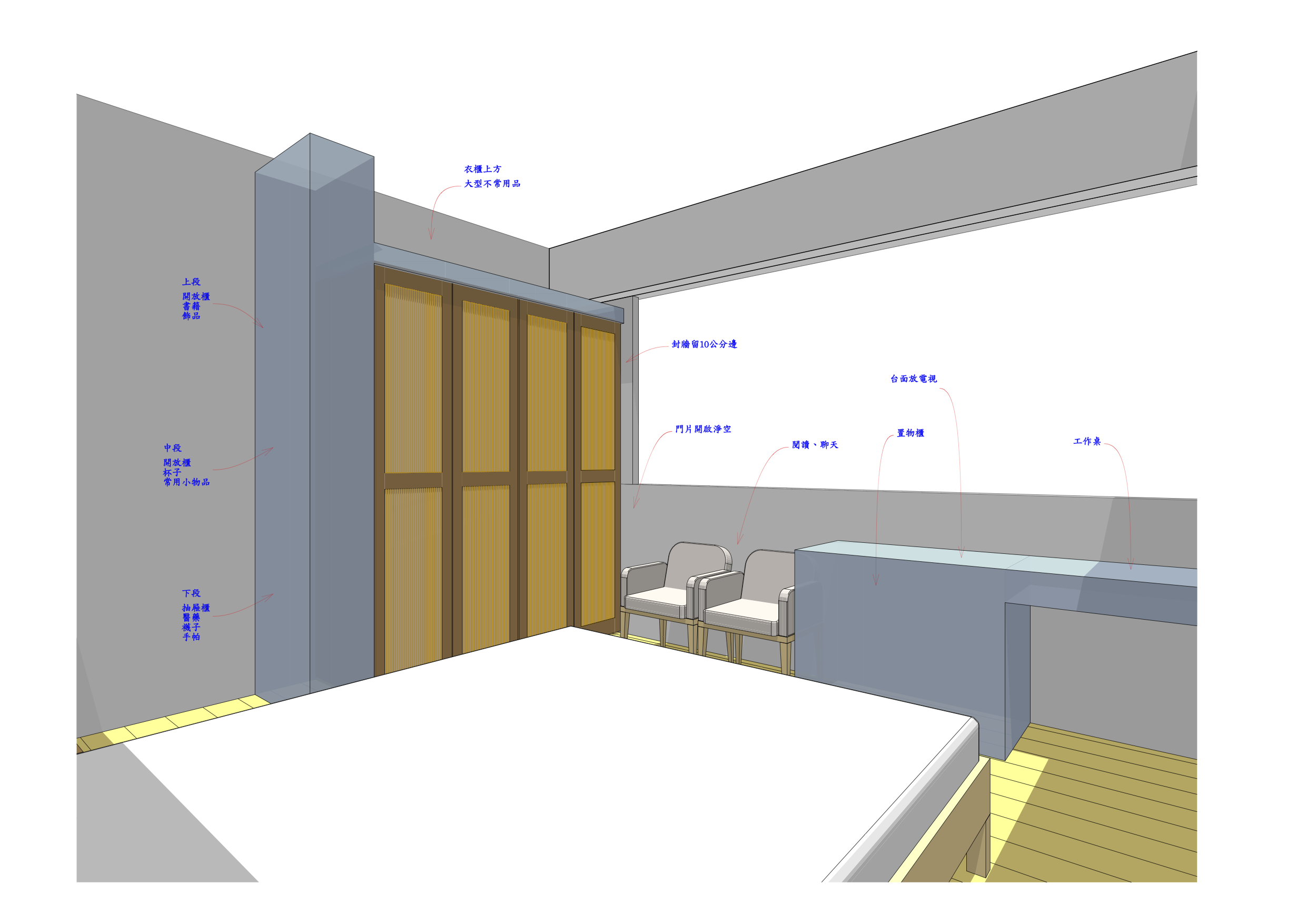 - 衣櫃門開啟須留淨空區,加大淨空區放置可活動的休閒倚。