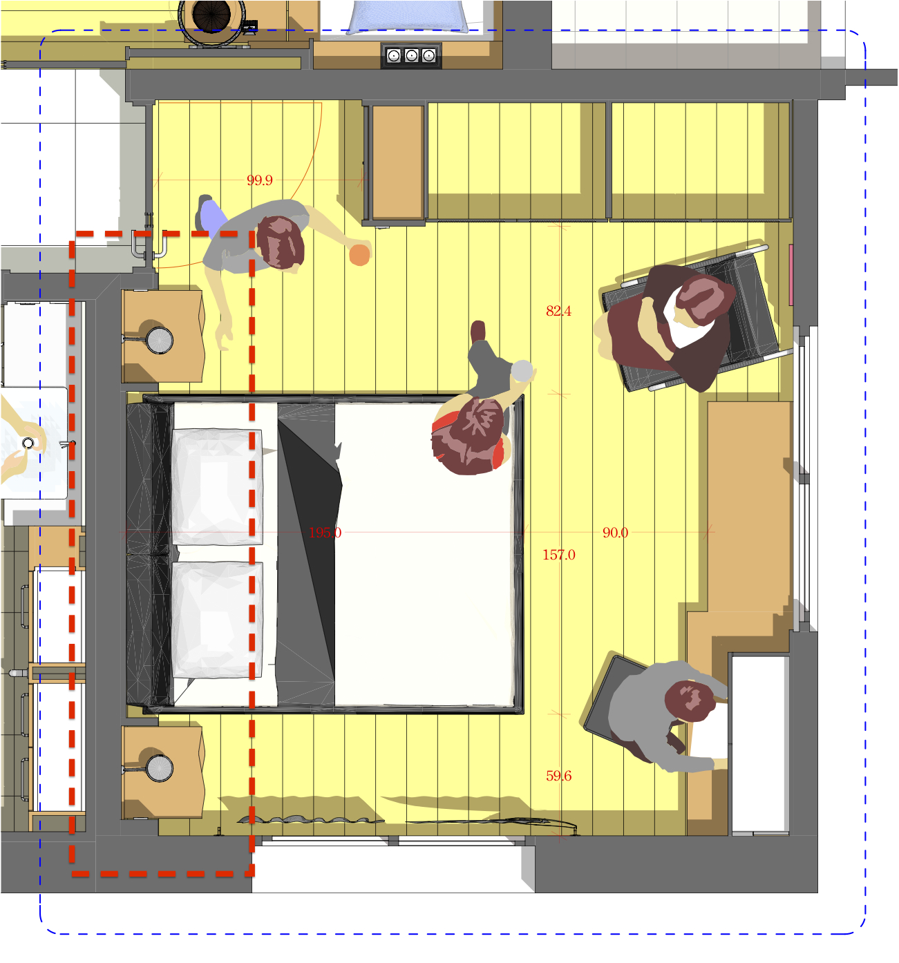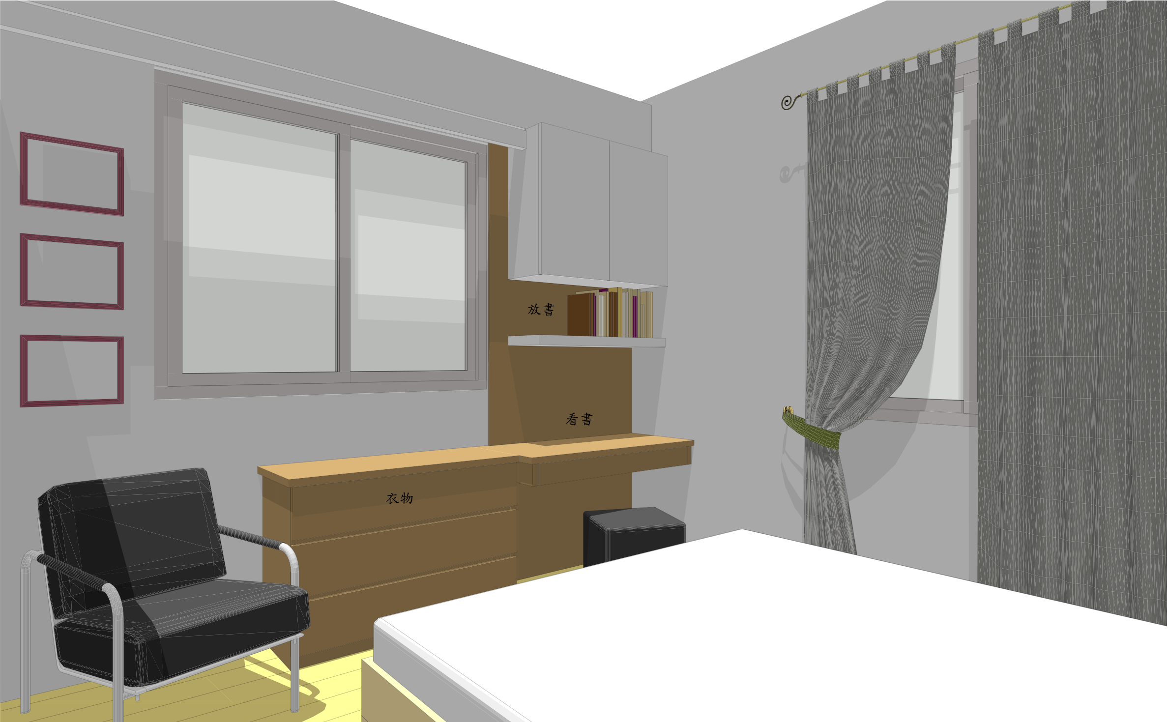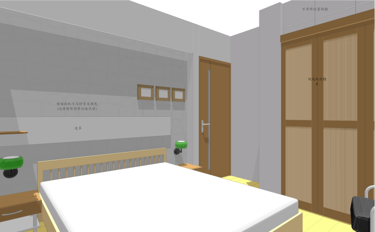 - 衣櫃門開啟須留淨空區,加大淨空區放置可活動的休閒倚。