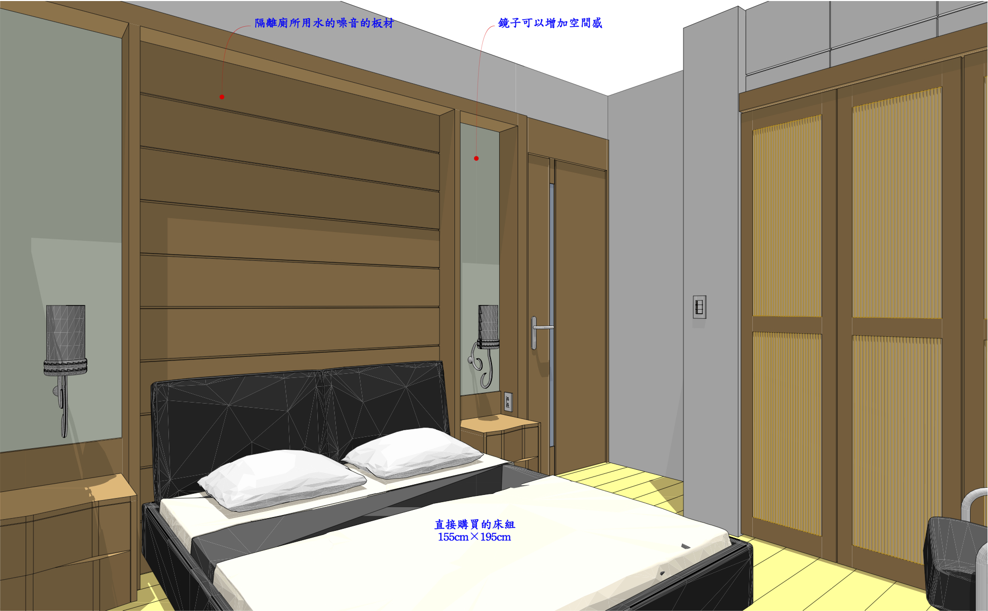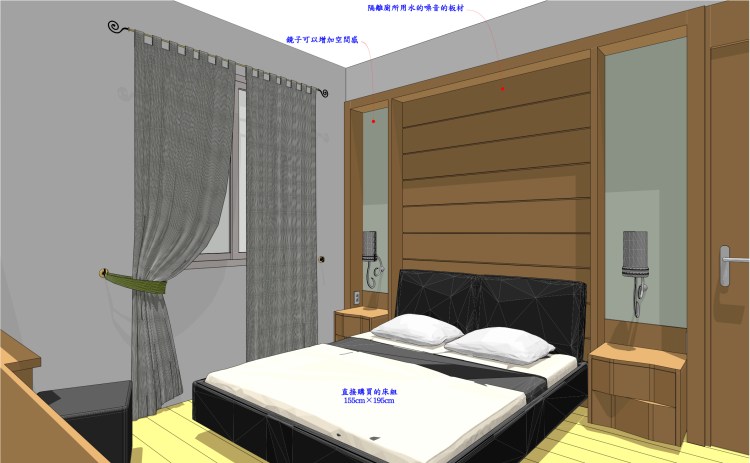 主臥房原先半套廁所讓給母親房使用,因此修正平面配置,本來北向牆面作為床頭使用。