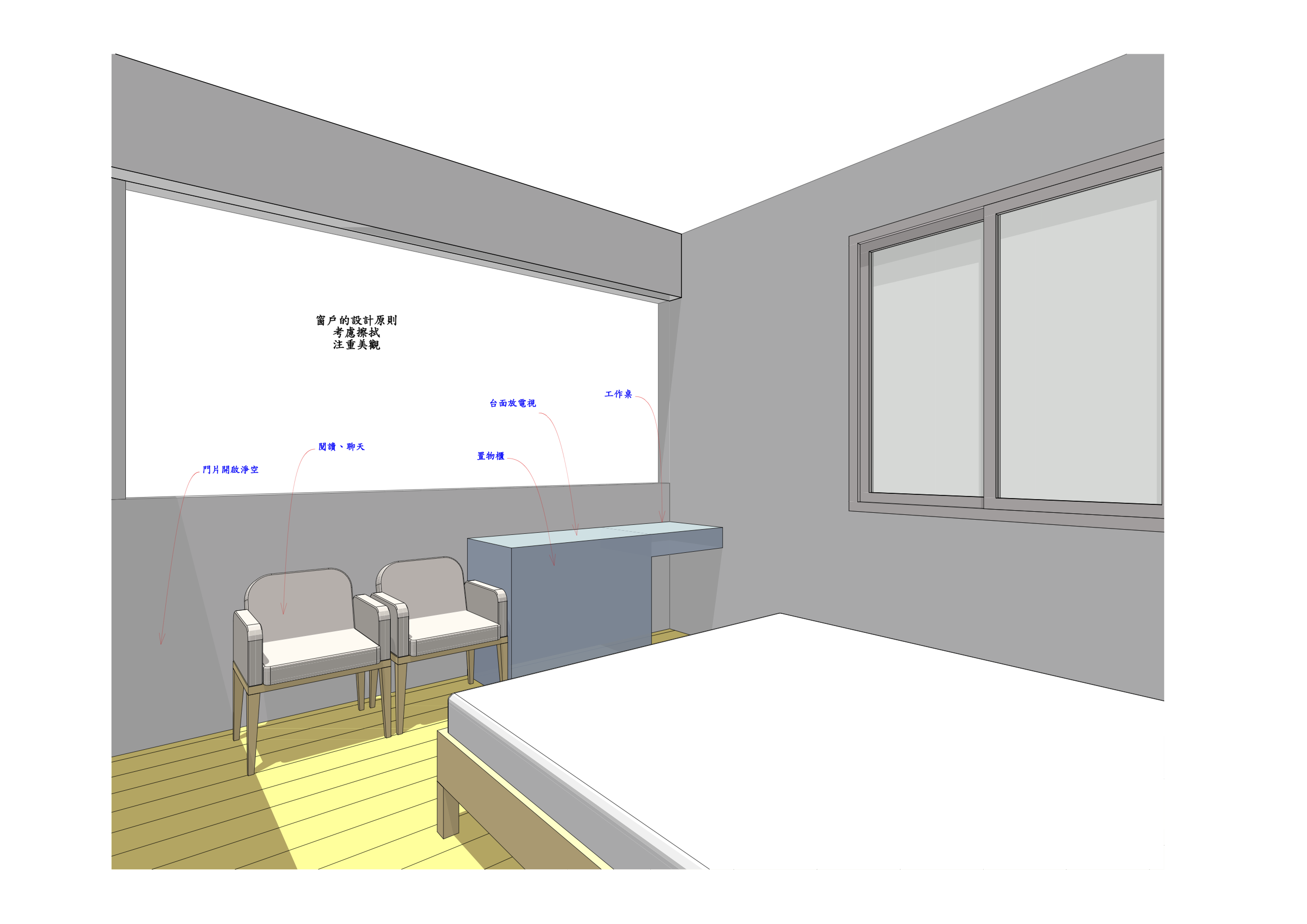 - 屋主怕冷,開窗位置考慮光線變化過大的影響,適當窗戶大小減少溫度傳透影響。