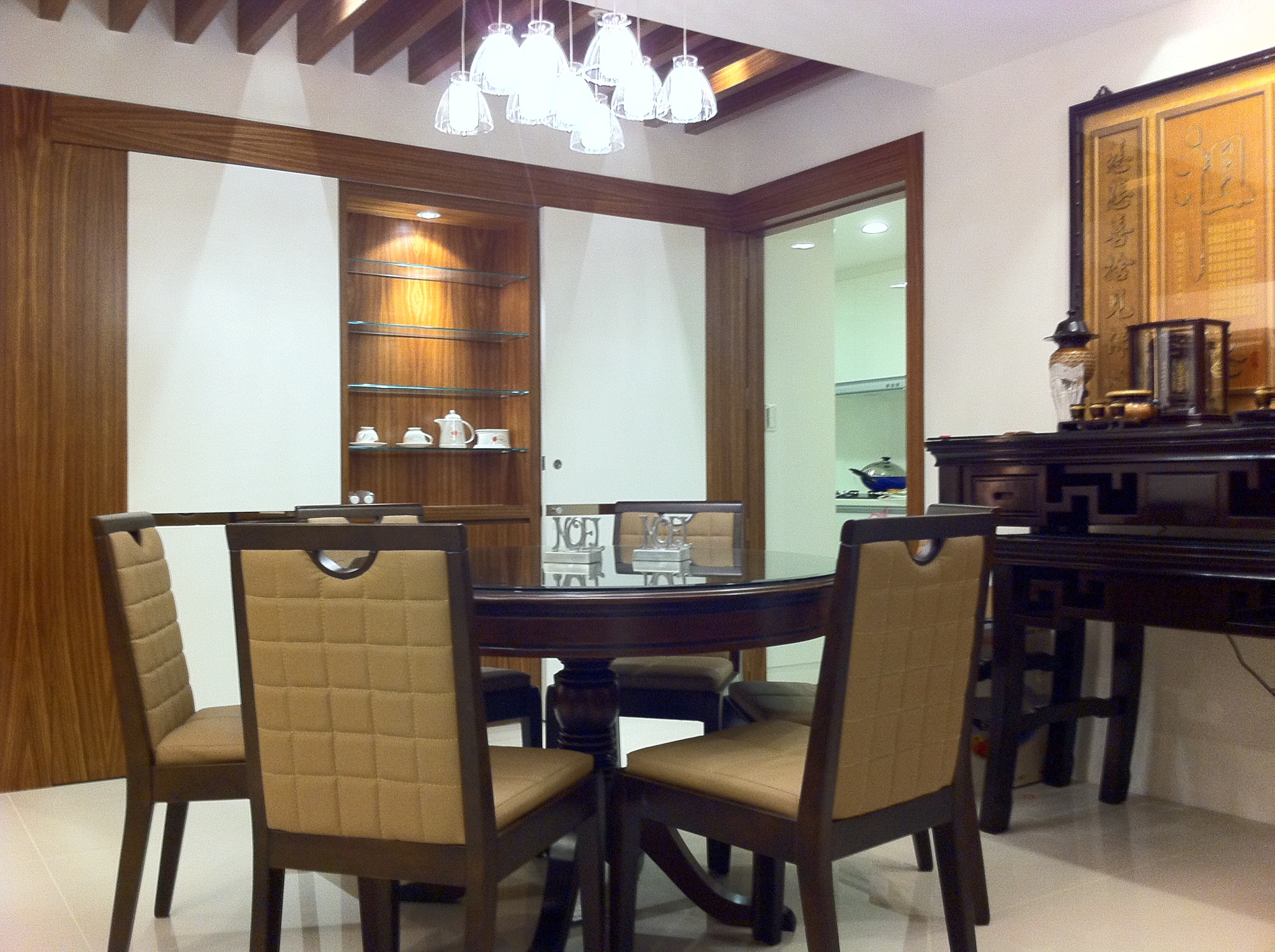 中間展示著主人收藏自己喜愛的杯具,下方櫥櫃收納餐廳需求物品,兩側白色的造形則是有功能的,平時為裝飾用的造形來平衡空間感,一旦需要時它搖身一變成了兩個多功能的門扇。