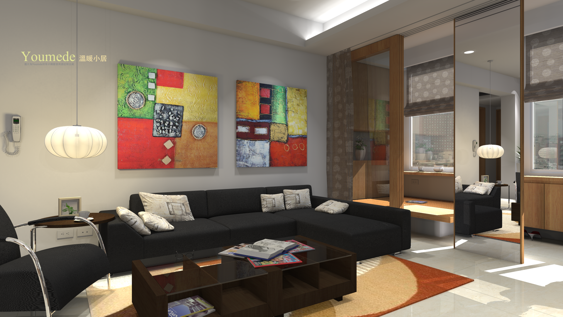 空間變得大點,打開拉門來發揮散熱效果,活動的鏡子不時地調整位置,室內氣氛有趣極了!