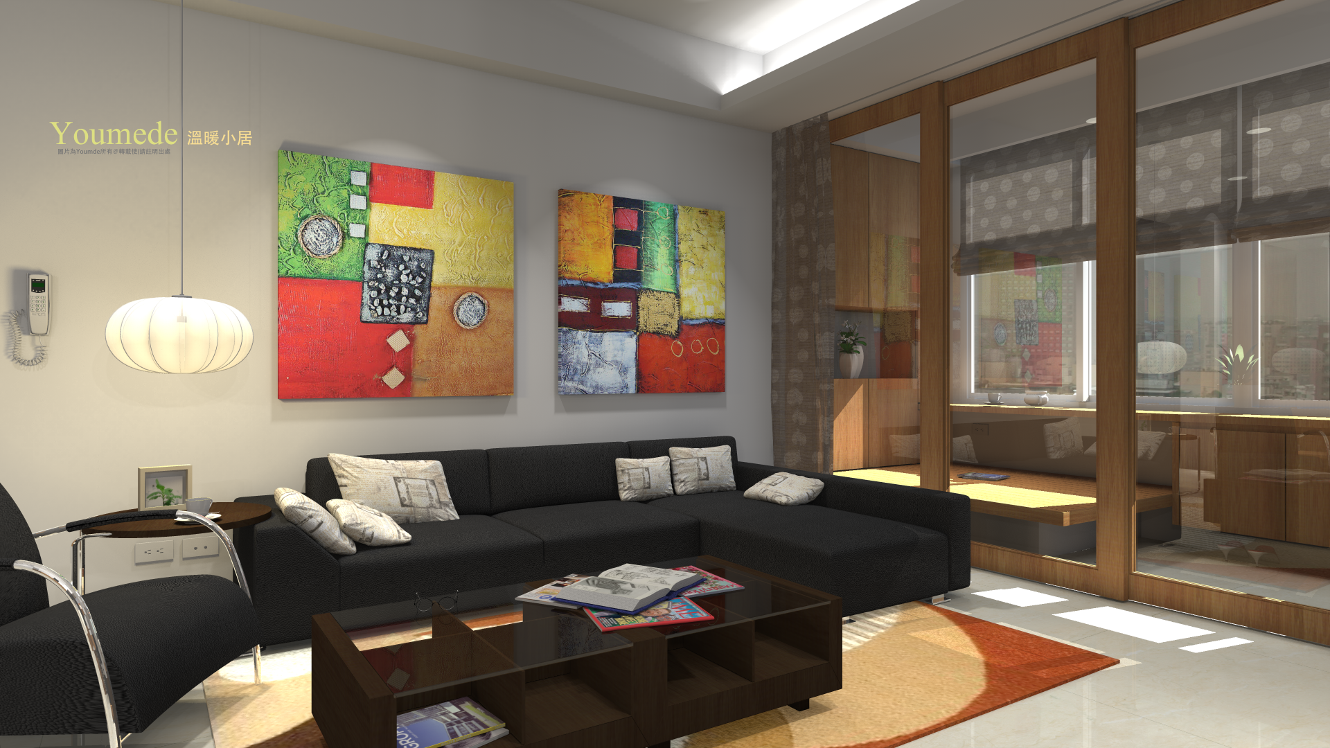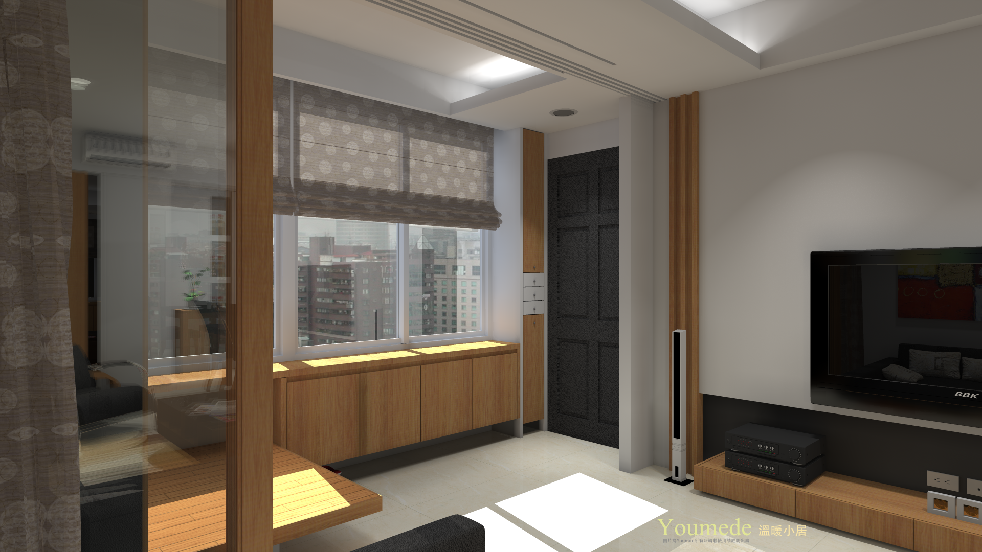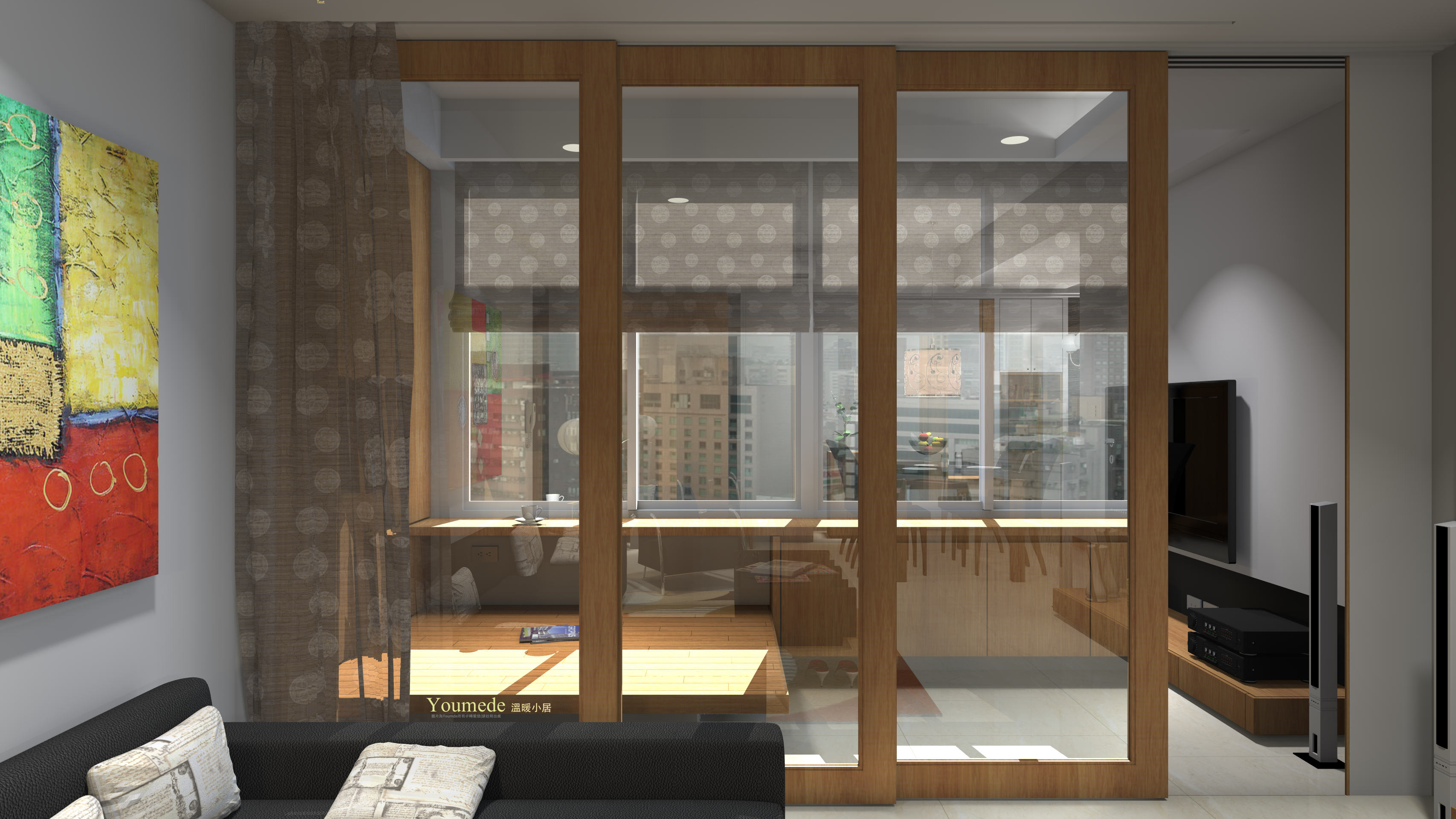玄關與客廳用滑動門方式區隔,四扇滑動門,保暖了客廳,透明將光線帶進來。
