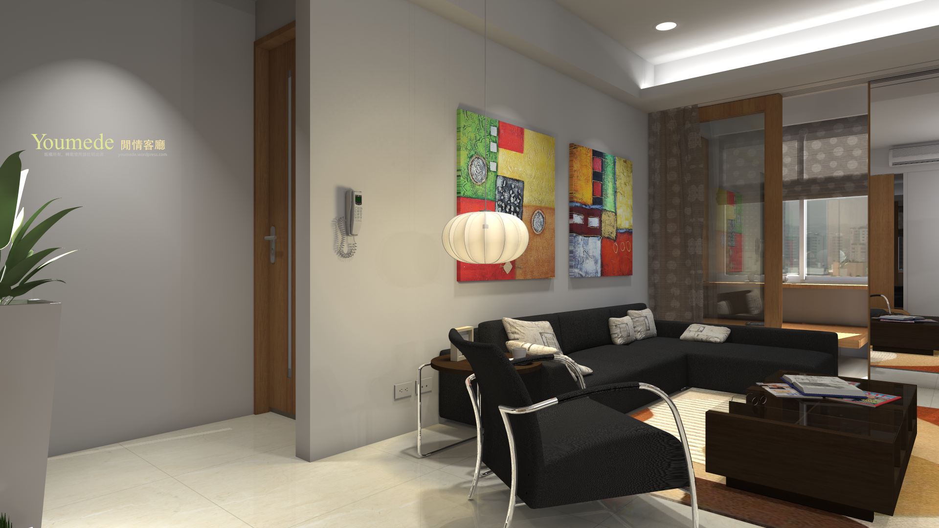 這一個空間運用一盞紙質的吊燈,自然而然產生兩個虛實的空間,純淨白色背景搭配活潑橘色,就是年輕與活力感,黑色的皮製沙發是台灣人偏愛的,抗髒耐汚並帶有穩重正直的特性。
