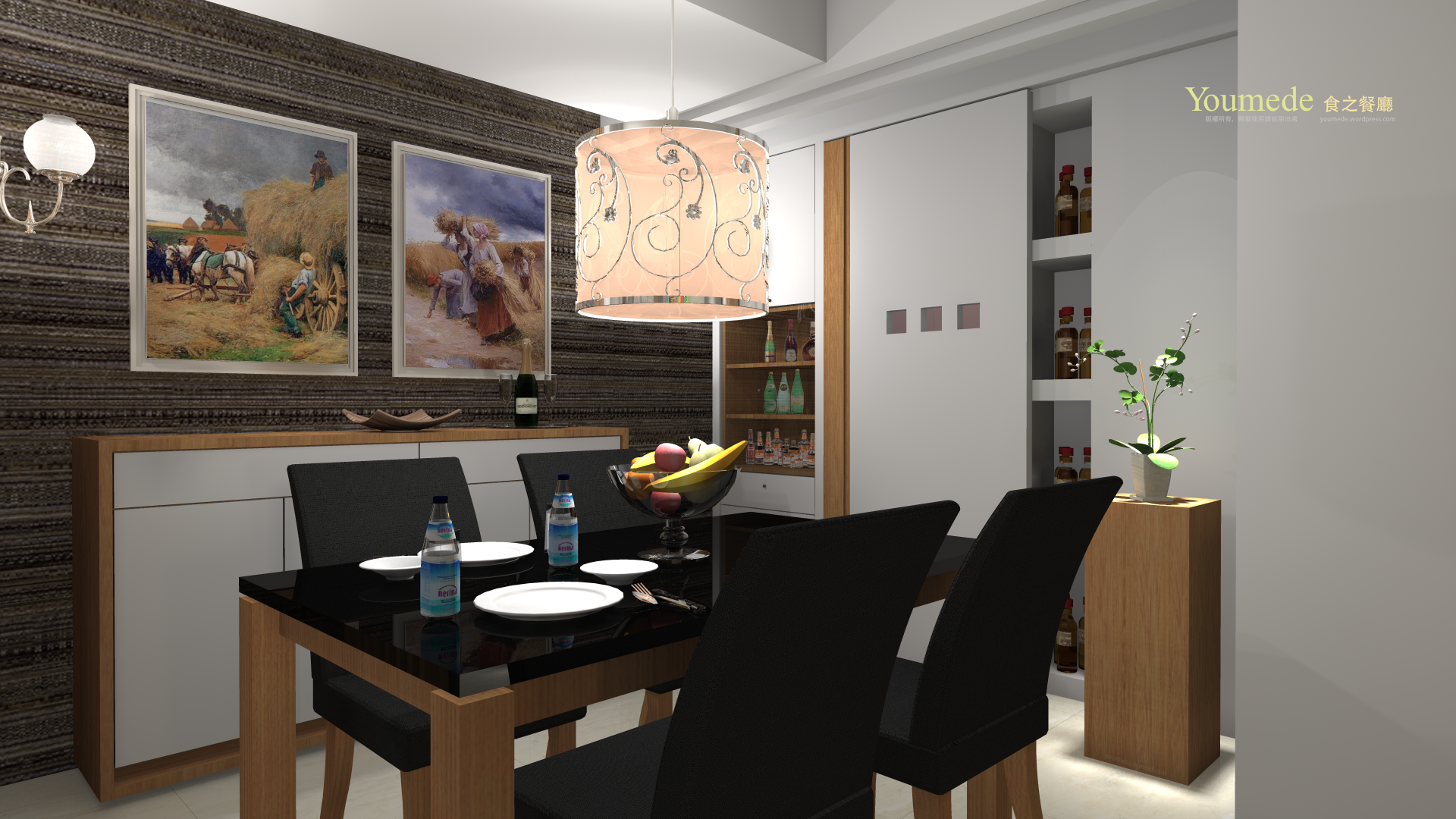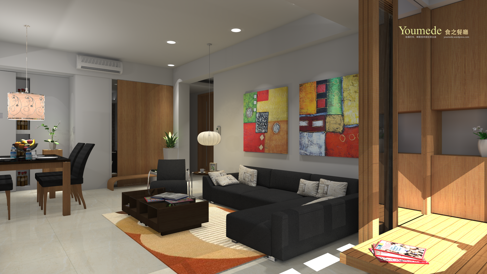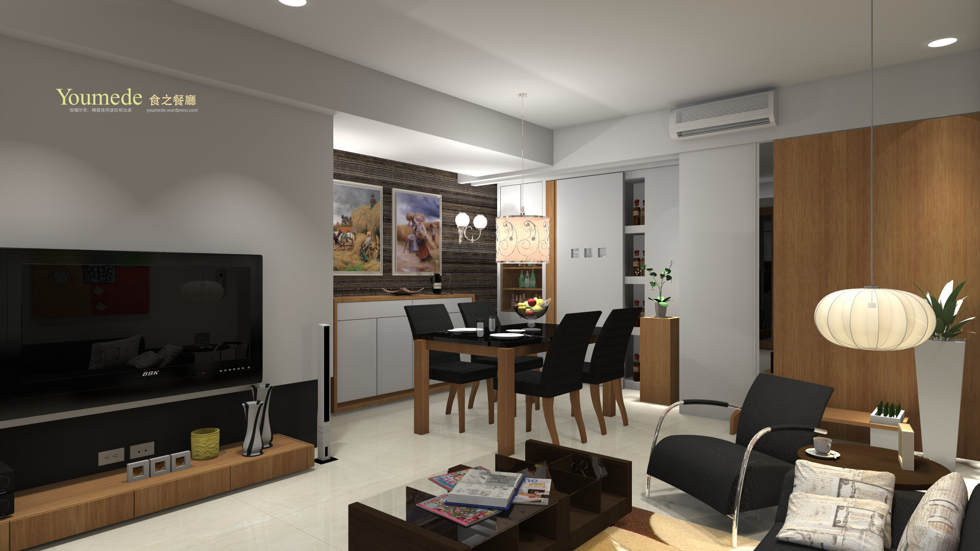 許多功能性在造型上,例如:瓶罐的收納和展示,常用器具收藏。由拉門可以通往廚房,拉門上有三個觀景窗,用來瞭解裡外的情況,拉把是用木皮材質的線型板來作用。