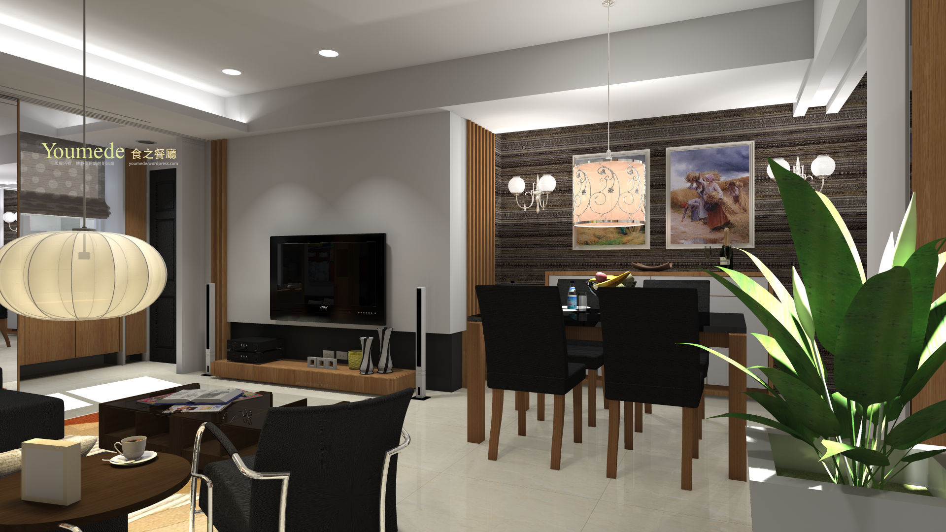對於不時的招待朋友來說,咖啡色橫紋壁布有穩重高雅讓人賓至如歸的感覺,並且連貫整個客廳空間氛圍,此外,餐廳規劃為彈性六到八人的使用模式。