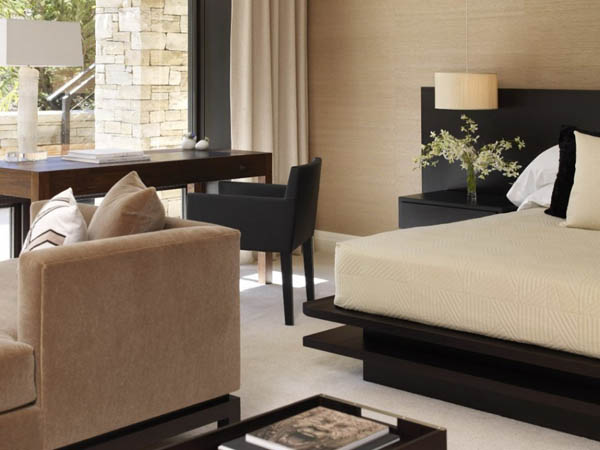 這一個空間利用米黃當作背景色彩,布質加強了溫暖的感覺,傢具主色也是米色調,而點綴色彩則是黑色系列,透過這些色彩元素組成了一個浪漫的空間。