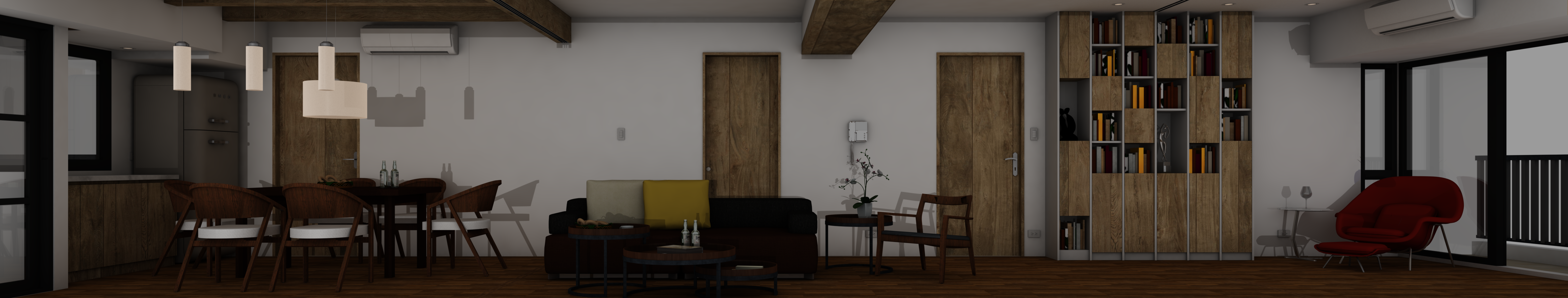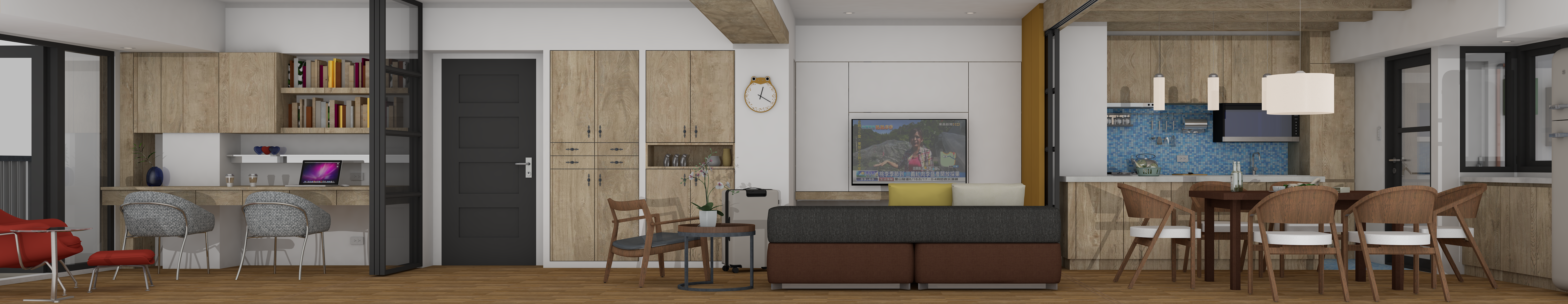 中島廚房總是人們心中的夢想,這裡必須以此為規劃主軸,然而長扁形狀的平面空間是一個規劃難題,14坪的空間要擠入客廳,玄關又可放大型的行李箱、電風扇,雙人的書房並可充當客房又可做瑜伽和個人休閒空間。