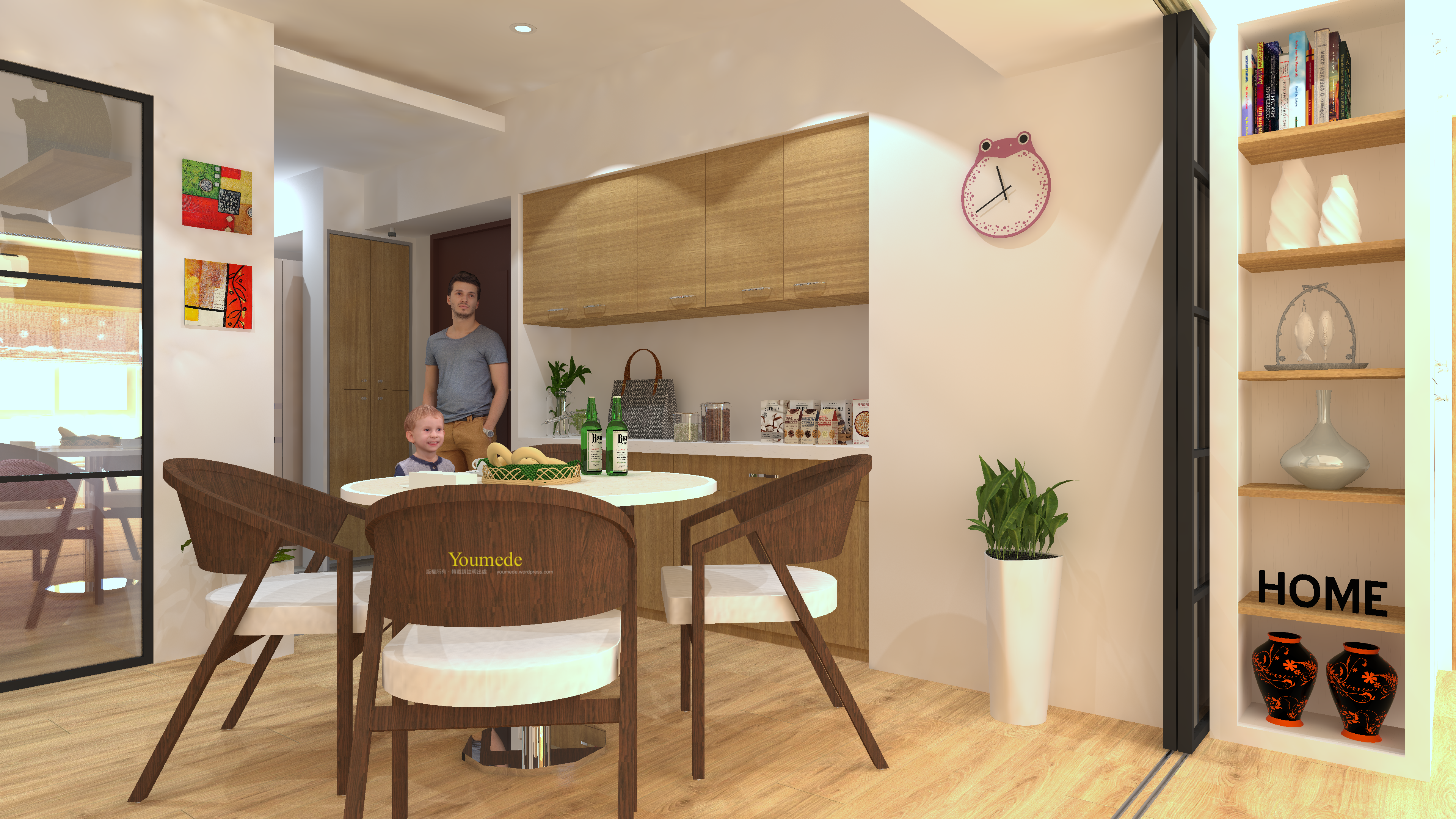 在餐廳中,它是吃飯的地方,也可以做一些休閒有趣的事,不僅如此,這個區域也是重要的過渡空間,例如通往客廳、廚房、後陽台、甚至大門外出的必經之地。在環境方面,可見到光進入此區而反射出各種變化的光影,四周房間的空氣流動在此做對量,讓每個空間的氣場活力十足。由於如此安排餐廳在出入動線的中心區,因此而變成人文空間的交會地,讓微小空間活絡起來。