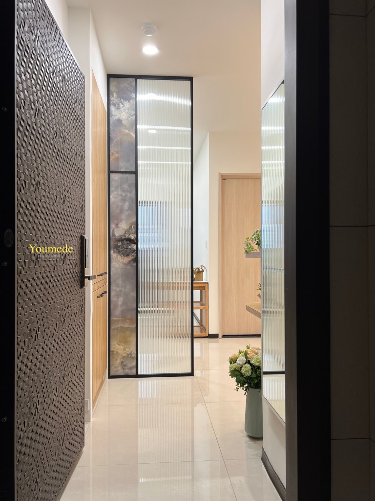 - 鐵件屏風搭配長虹玻璃,維持透光與隱私。
