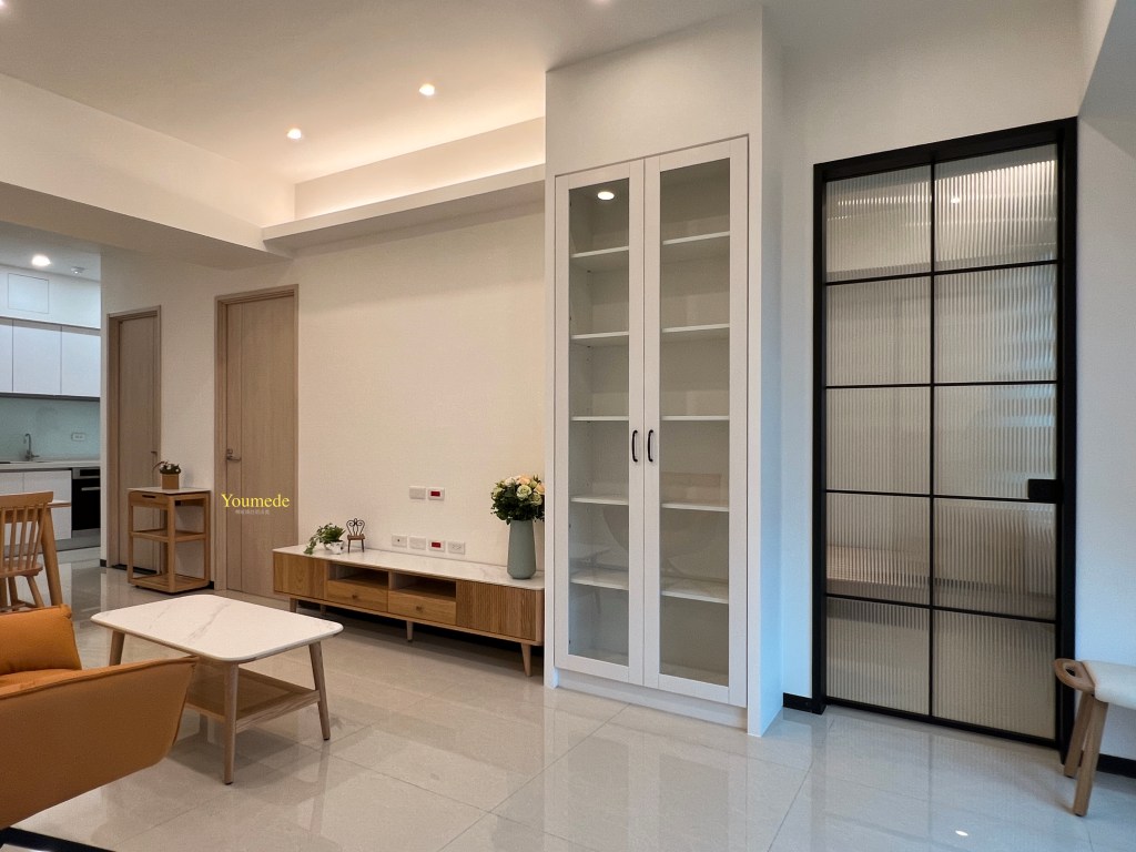 本案為小資族家庭設計,預算有限,因此採取「活動家具+固定櫥櫃」的配置策略,重要家具如沙發、電視櫃、餐桌、床組等選用活動式,搭配現場施作的收納櫥櫃,兼顧彈性與成本控制。